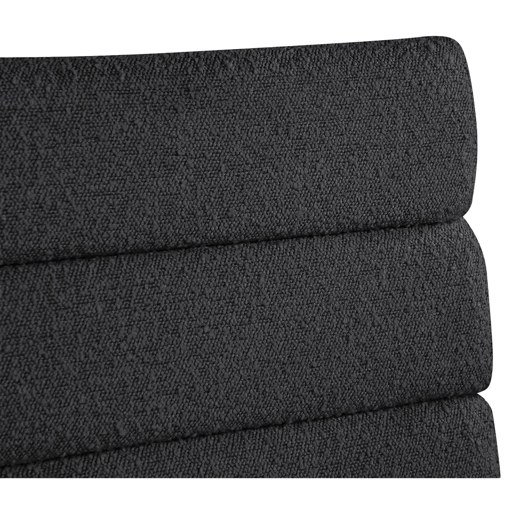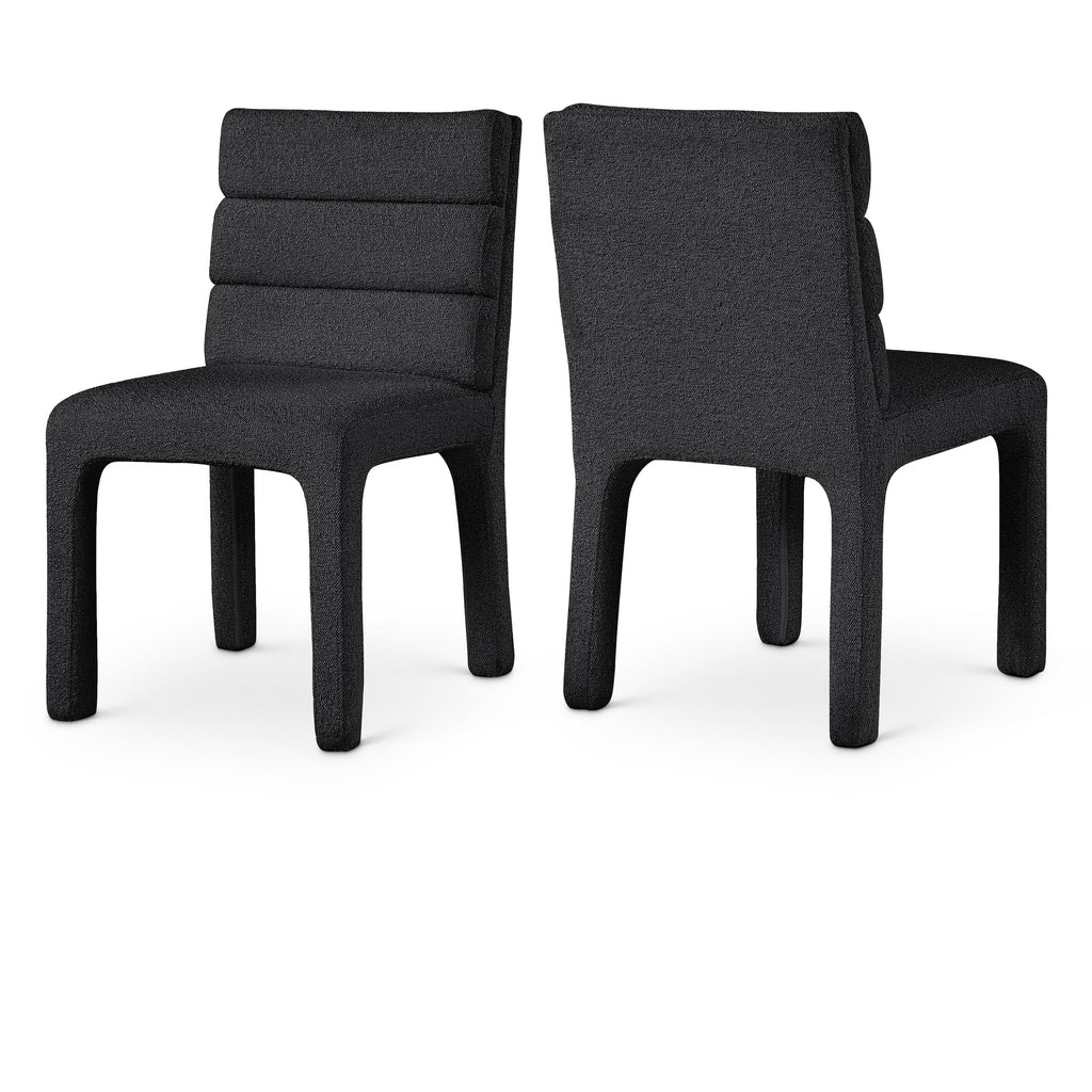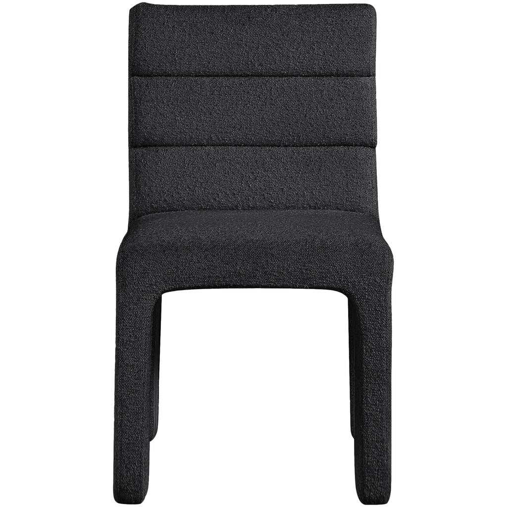 Comfort is key with this Kai boucle fabric dining chair. Stunningly elegant yet boldly understated by design, this dining chair is an ideal addition to your dining room setup. The metal frame ensures lasting durability while the black boucle fabric upholstery gives the chair a sleek and modish look. Tufting on the back adds to the chair's overall comfort level. Pair several of these chairs with your favorite dining table for a complete look.