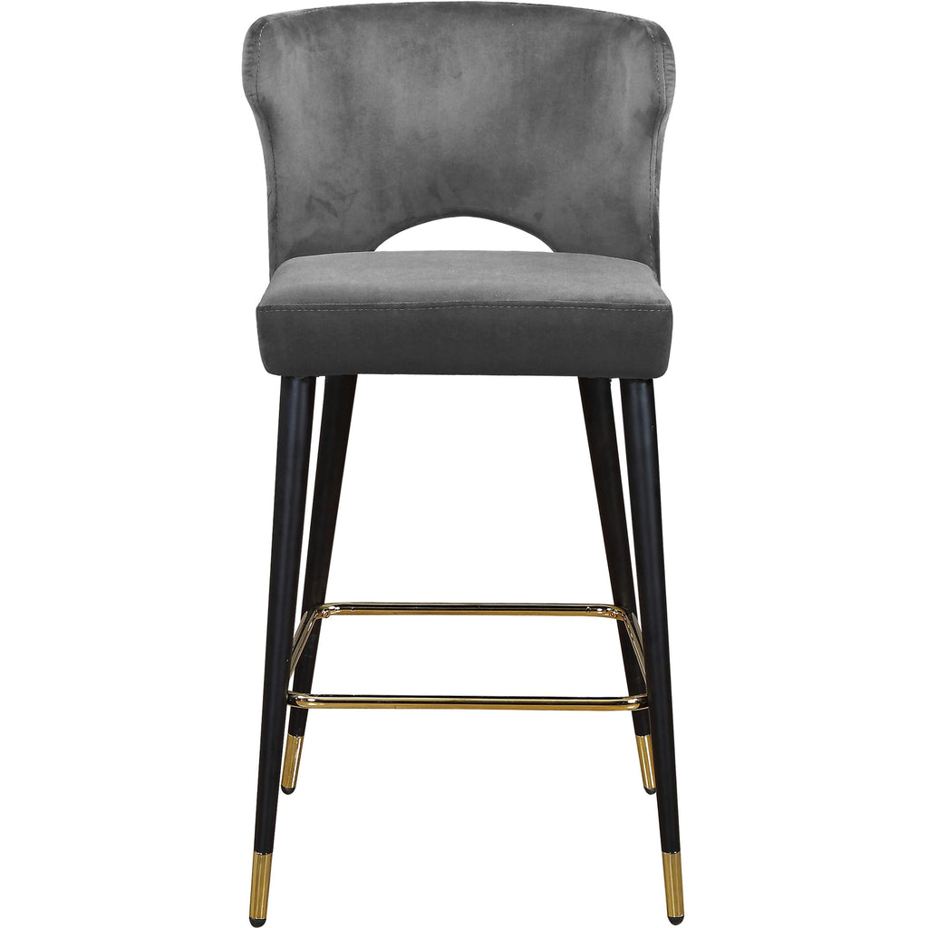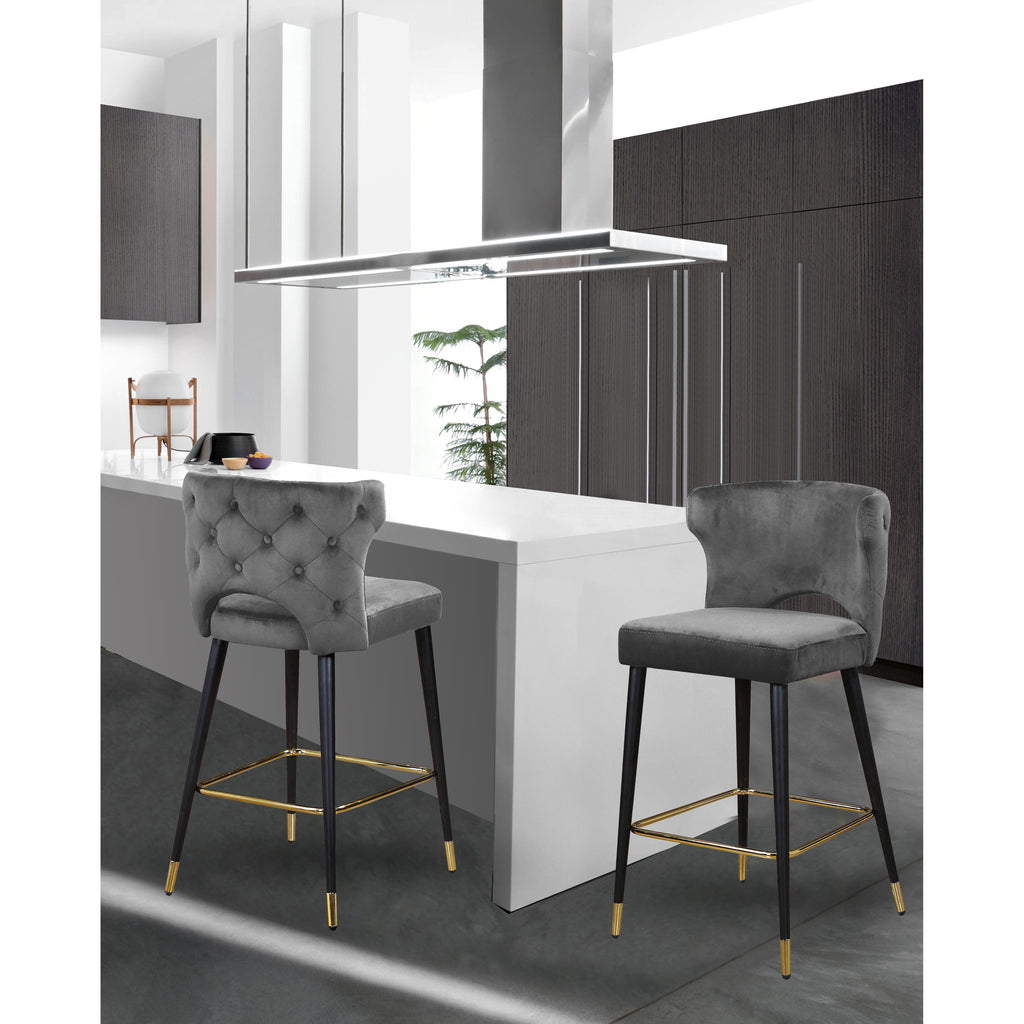 Sit comfortably on this Kelly Grey Velvet Stool. The back and seat cushions are plumply stuffed for enhanced comfort and covered in rich velvet upholstery to give your room a burst of color and jewel-toned fun. This stool has black metal legs with gold tips for added contemporary panache, and it's built strong and tough, so it stands up to heavy daily use without breaking a sweat. These stools can outfit any bar or kitchen counter area.