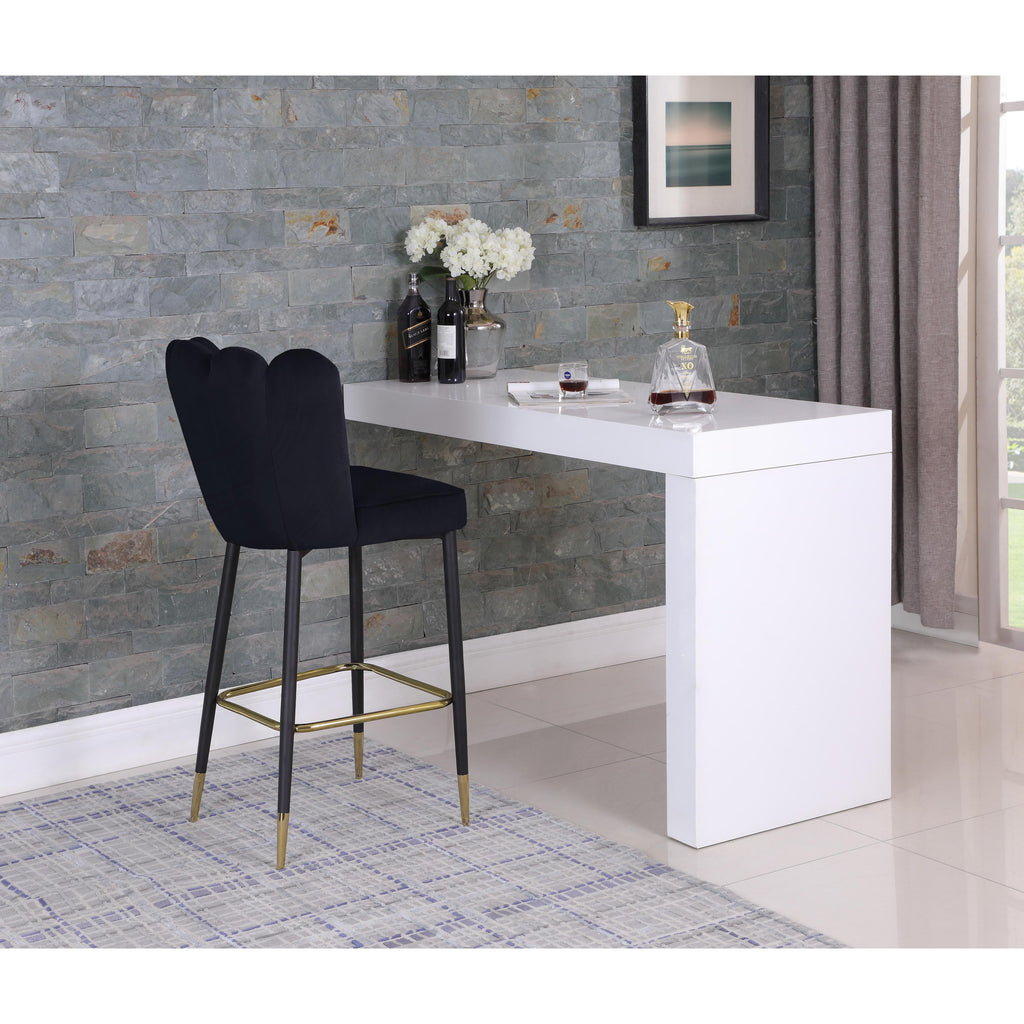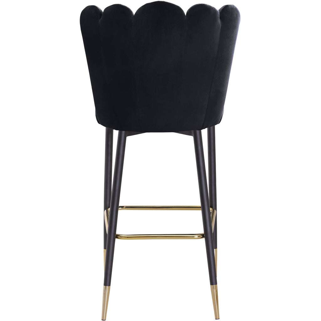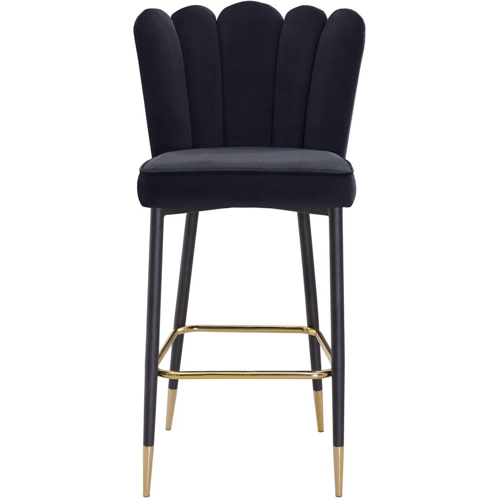 Fall fast and hard for the beautiful look of this Lily Bar Stool from Meridian Furniture. This lovely stool features a striking black velvet fan-style back with deep tufting that helps the padding inside stay full and aloft for added comfort. The cushioned seat and back are upholstered to the hilt for maximum luxury and beauty. Black metal legs with a matte finish and gold tips add contemporary appeal to this handsome stool whether used at the bar or kitchen counter.