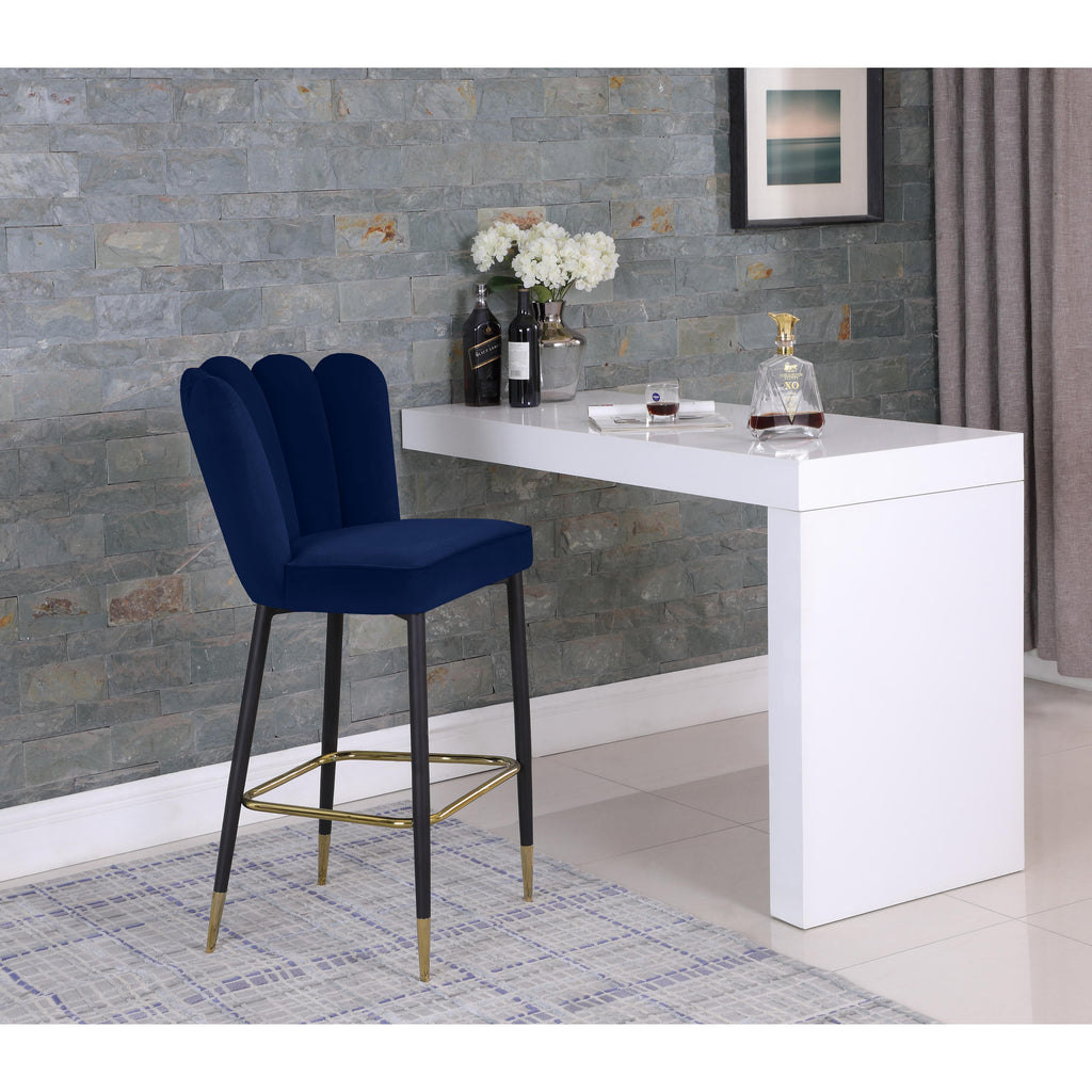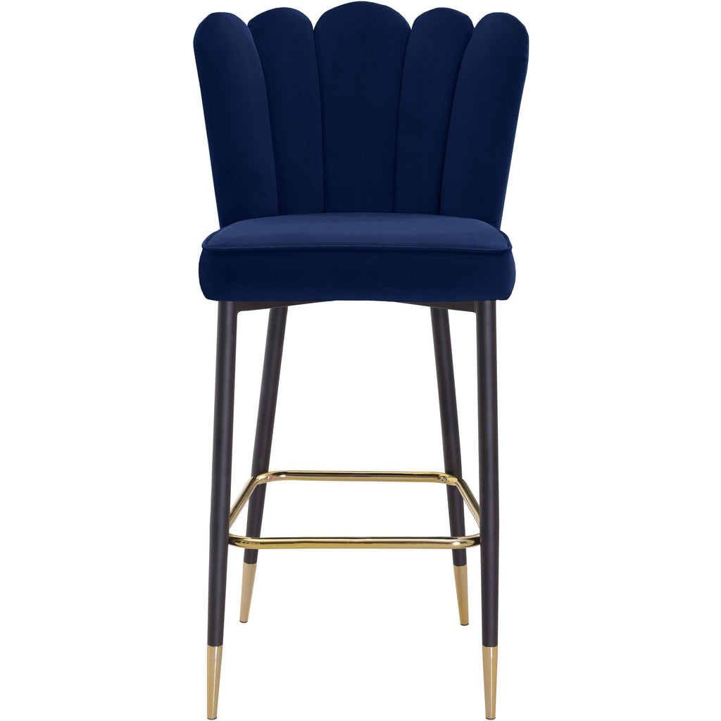 Fall fast and hard for the beautiful look of this Lily Bar Stool from Meridian Furniture. This lovely stool features a striking navy velvet fan-style back with deep tufting that helps the padding inside stay full and aloft for added comfort. The cushioned seat and back are upholstered to the hilt for maximum luxury and beauty. Black metal legs with a matte finish and gold tips add contemporary appeal to this handsome stool whether used at the bar or kitchen counter.