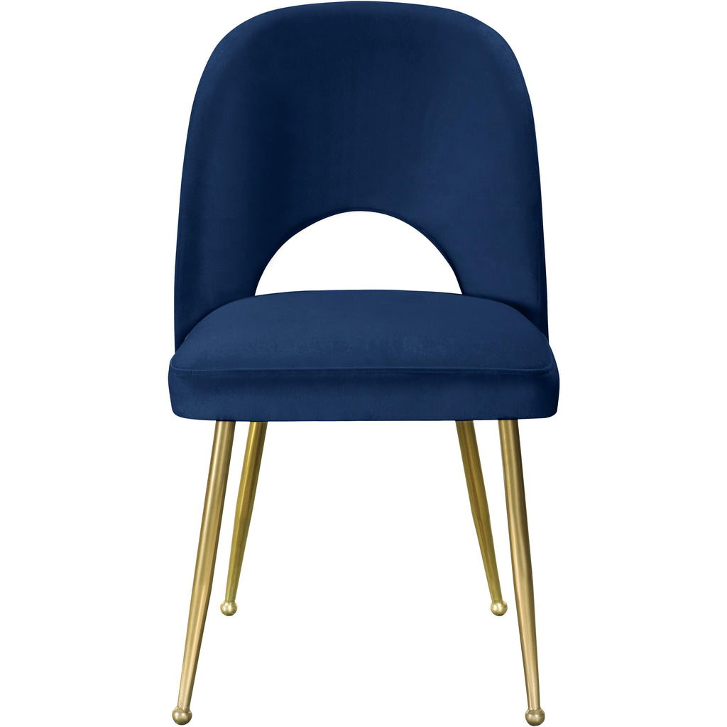 Sit for hours on the Logan navy velvet dining chair, no matter what may be the task at hand. Both the back and seat are both well-cushioned with foam, and the back has a semicircular cutout in the lumbar area for your comfort. The chair has a wooden frame, and is supported by four brushed gold legs, with decorative balls for feet. Contemporary in style, this chair goes well with any table or decor scheme.