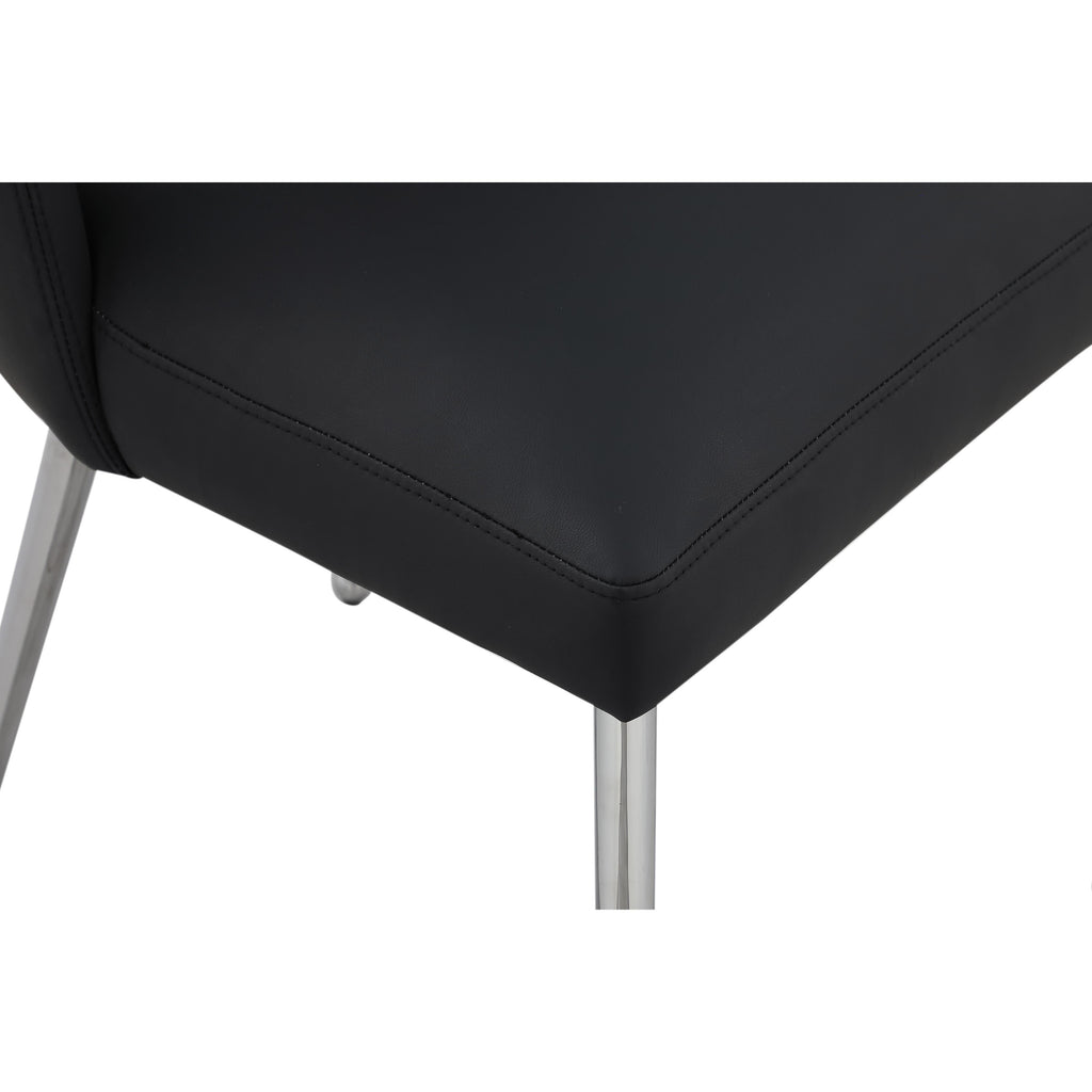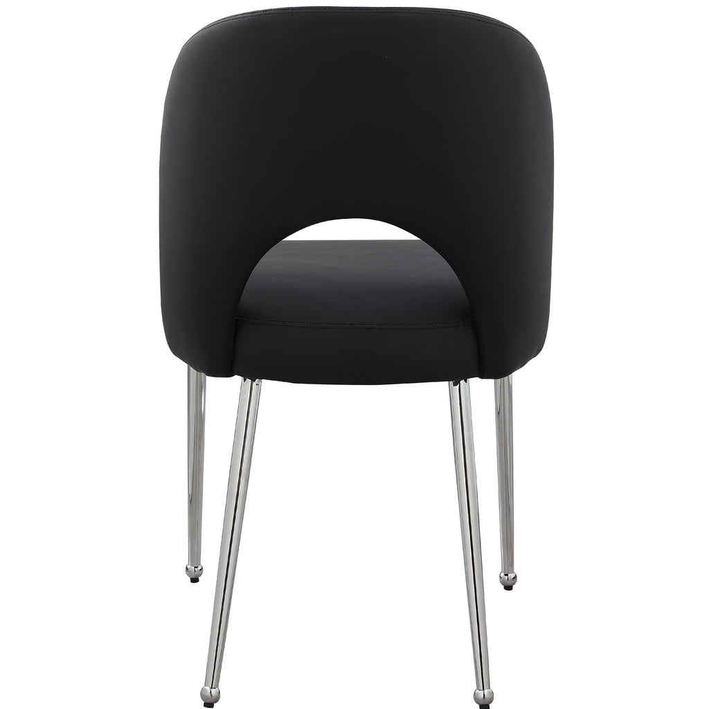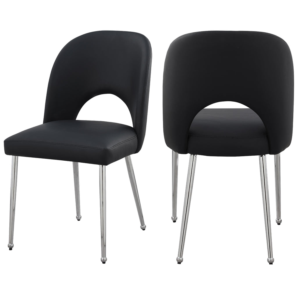 Give your dining area a modern makeover with this Logan black vegan leather dining chair. Featuring soft black vegan leather upholstery, this dining chair is both luxurious and comfortable. Its rich chrome finish complements its black seat and backrest, making it the perfect addition for any contemporary home. Its unique curved, open-back backrest provides ample physical support for your spine, and its plush seat cushion provides a cozy place to sit. This chair is just the right height to sit at any dining table or breakfast bar.