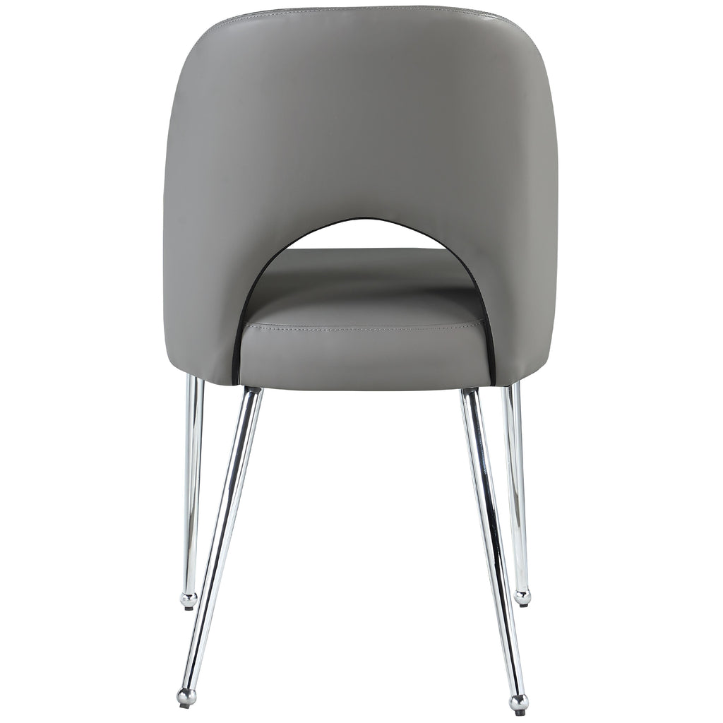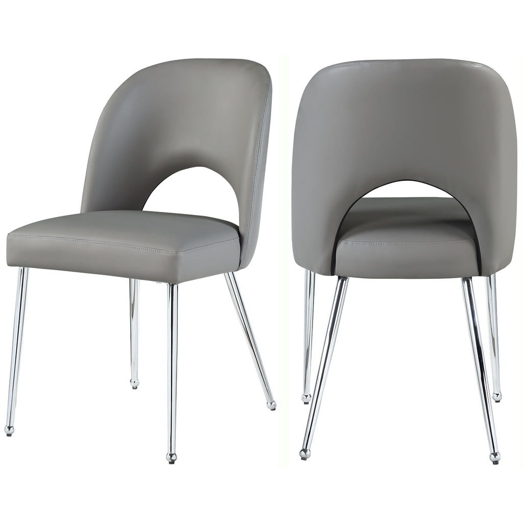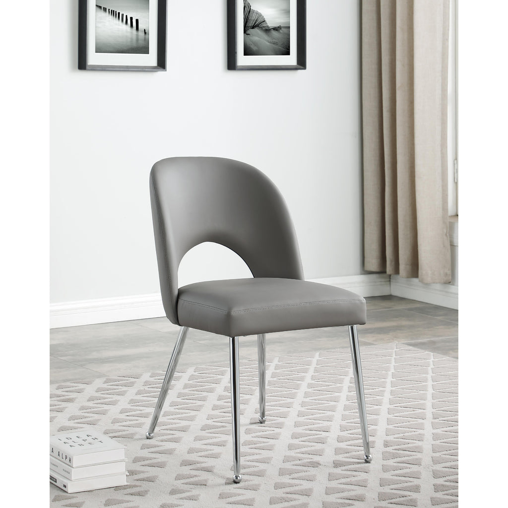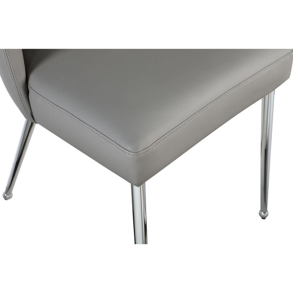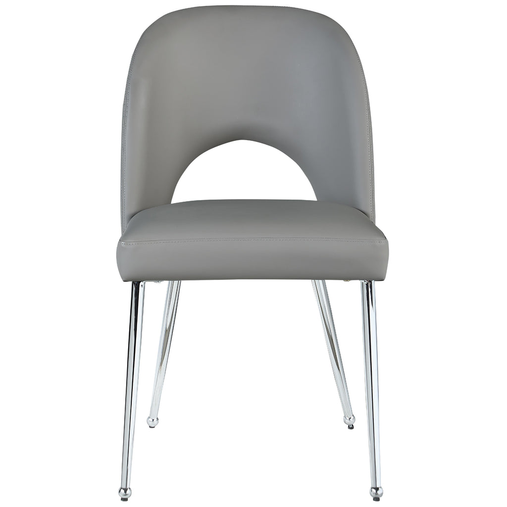 Give your dining area a modern makeover with this Logan grey vegan leather dining chair. Featuring soft grey vegan leather upholstery, this dining chair is both luxurious and comfortable. Its rich chrome finish complements its grey seat and backrest, making it the perfect addition for any contemporary home. Its unique curved, open-back backrest provides ample physical support for your spine, and its plush seat cushion provides a cozy place to sit. This chair is just the right height to sit at any dining table.