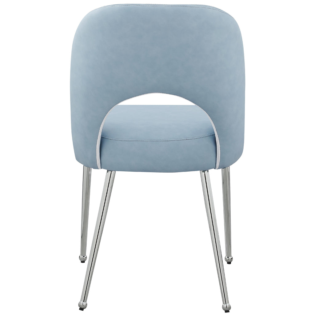 Give your dining area a modern makeover with this Logan light blue vegan leather dining chair. Featuring soft light blue vegan leather upholstery, this dining chair is both luxurious and comfortable. Its rich chrome finish complements its light blue vegan leather seat and backrest, making it the perfect addition for any contemporary home. Its unique curved, open-back backrest provides ample physical support for your spine, and its plush seat cushion provides a cozy place to sit. This chair is just the right height to sit at any dining table or breakfast bar.