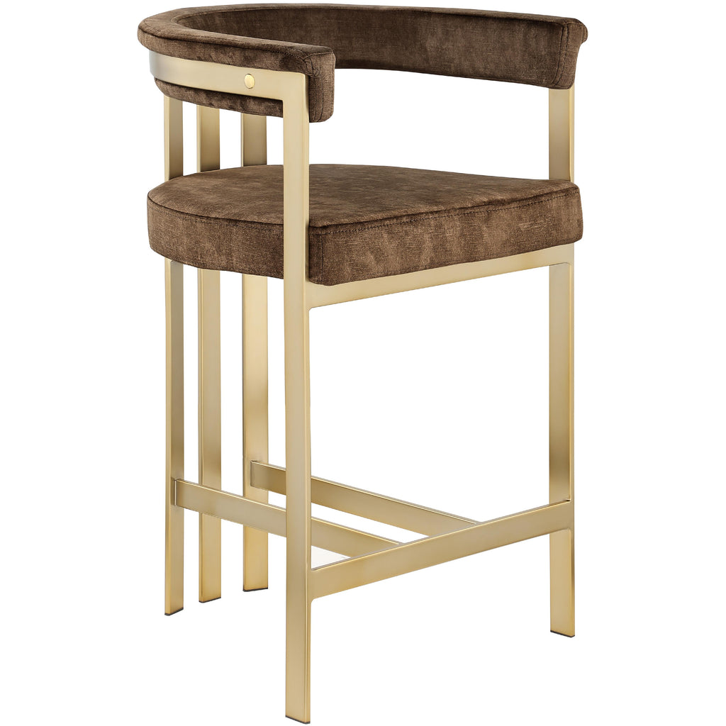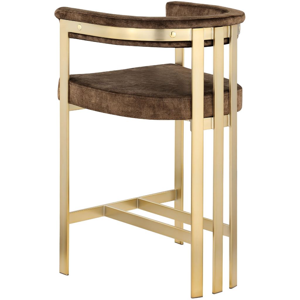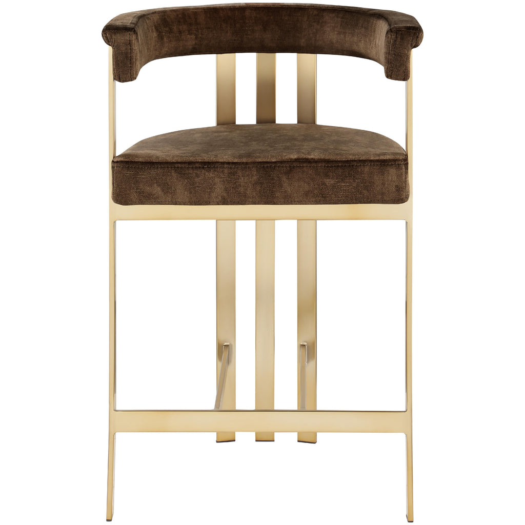 Turn your dining space into a contemporary haven with this Marcello brown velvet counter stool. Its soft, high-end brown velvet is soft for you to sit on, while its brushed brass iron frame ensures durability for years to come. Its curved back provides support while you sit and enjoy your meal, so your back won't get tired or hurt while you eat. Its curved, contemporary design is perfect for any modern home.