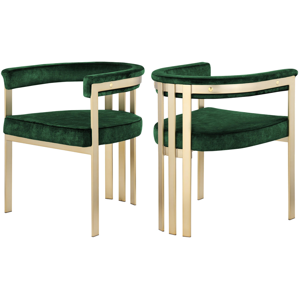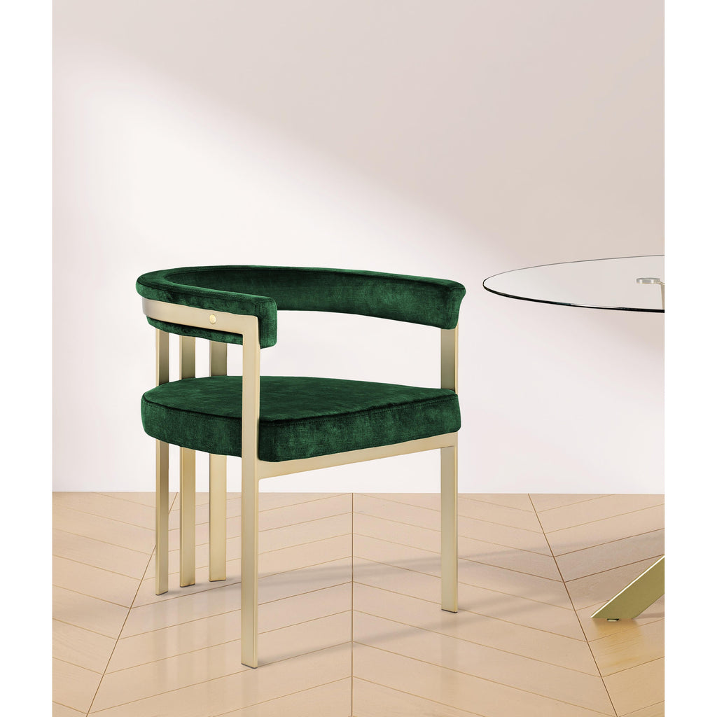 Turn your dining space into a contemporary haven with this Marcello green velvet dining chair. Its soft, high-end green velvet is soft for you to sit on, while its brushed brass iron frame ensures durability for years to come. Its curved back provides support while you sit and enjoy your meal, so your back won't get tired or hurt while you eat. Its curved, contemporary design is perfect for any modern home.