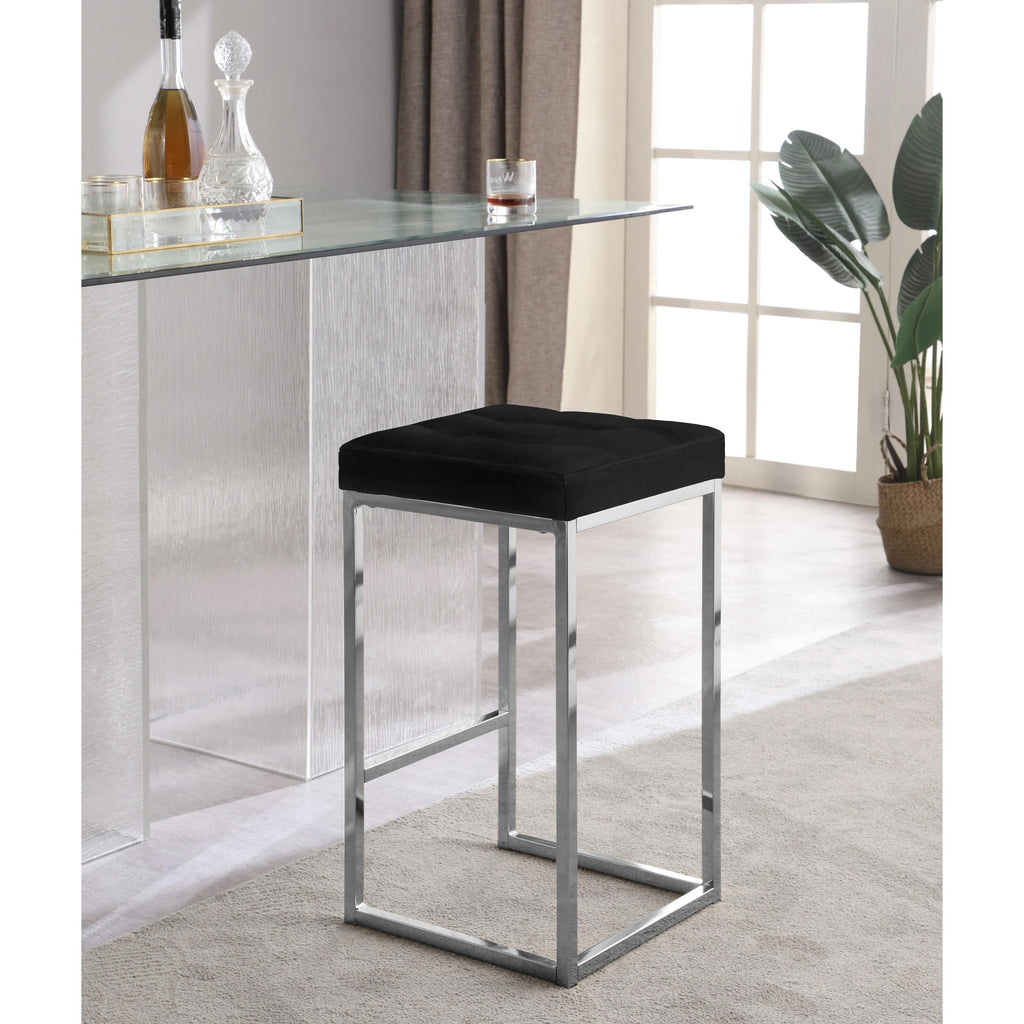 This Nicola Black Velvet Counter Stool from Meridian Furniture is bound to become everyone's favorite spot to rest. Whether used at the home bar or the kitchen counter, this stool brings a flair of elegance and beauty to any room. The chrome steel base is modish and contemporary, adding an up-to-the-minute vibe to your kitchen or other area. Upholstered in rich black velvet, this stool has a heavily cushioned seat for comfort while you sip your favorite cocktail or settle in for a plate of French toast.