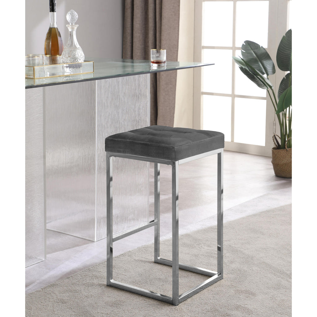 This Nicola Grey Velvet Counter Stool from Meridian Furniture is bound to become everyone's favorite spot to rest. Whether used at the home bar or the kitchen counter, this stool brings a flair of elegance and beauty to any room. The chrome steel base is modish and contemporary, adding an up-to-the-minute vibe to your kitchen or other area. Upholstered in rich grey velvet, this stool has a heavily cushioned seat for comfort while you sip your favorite cocktail or settle in for a plate of French toast.