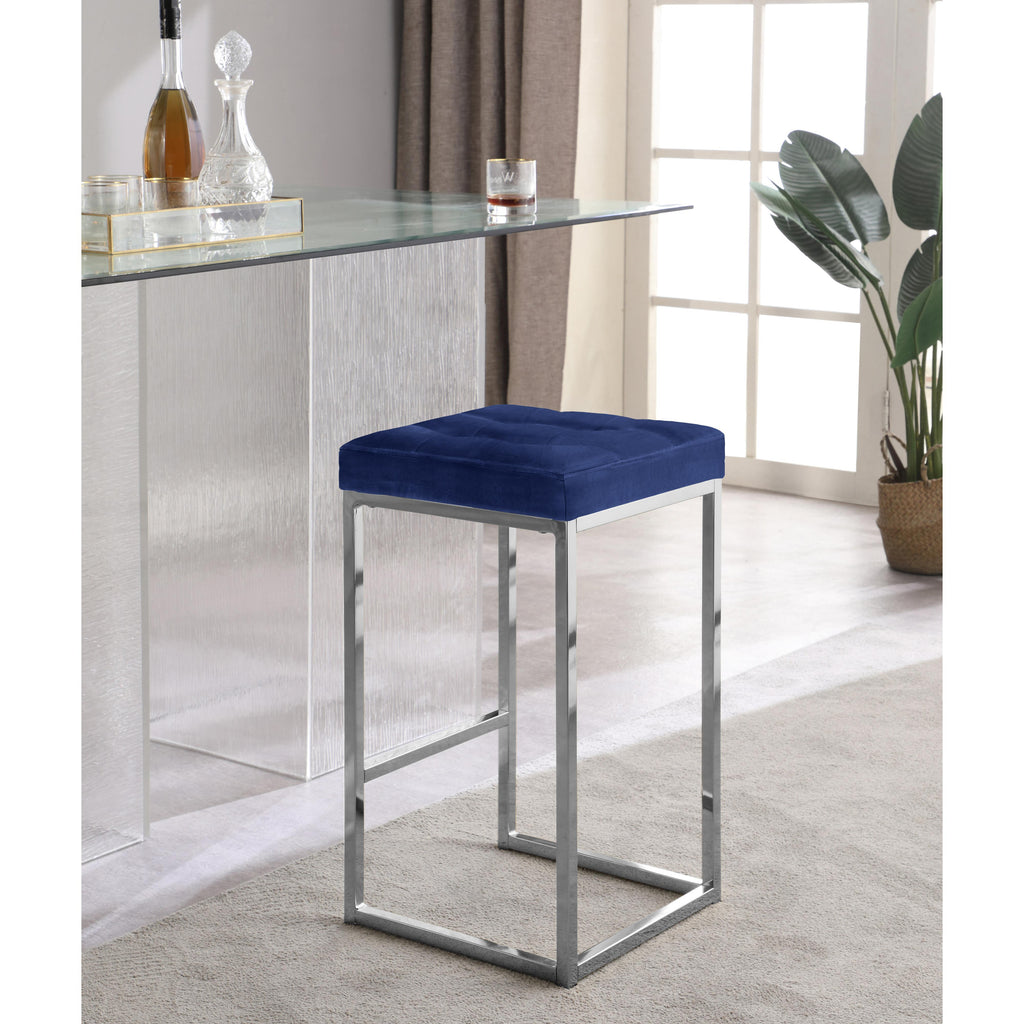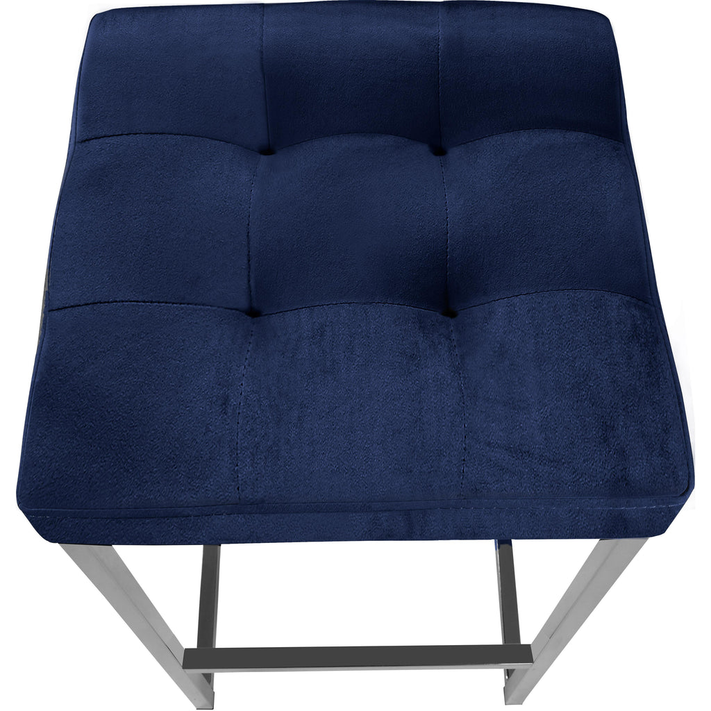 This Nicola Navy Velvet Counter Stool from Meridian Furniture is bound to become everyone's favorite spot to rest. Whether used at the home bar or the kitchen counter, this stool brings a flair of elegance and beauty to any room. The chrome steel base is modish and contemporary, adding an up-to-the-minute vibe to your kitchen or other area. Upholstered in rich navy velvet, this stool has a heavily cushioned seat for comfort while you sip your favorite cocktail or settle in for a plate of French toast.