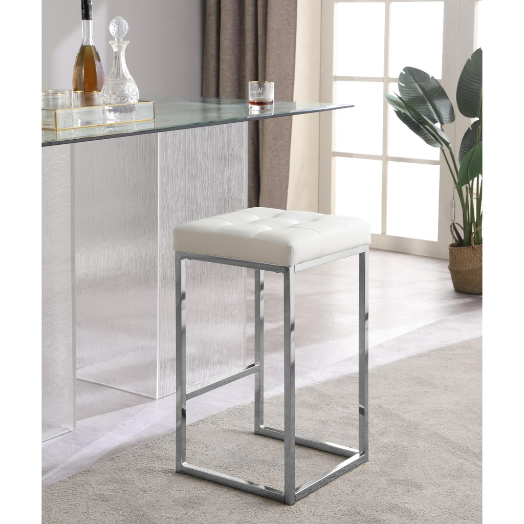 Saunter up to the home bar or kitchen counter and have a seat on this Nicola White Vegan Leather Counter Stool. An elegant armless design adds contemporary panache to your space, and construction with chrome-finished steel gives ample support to the stool while ensuring a modish look. A thick cushion on top is upholstered in soft and durable white vegan leather that feels just like the real thing but lasts and lasts with minimal upkeep. The addition of a footrail on the base makes for added sitting comfort.