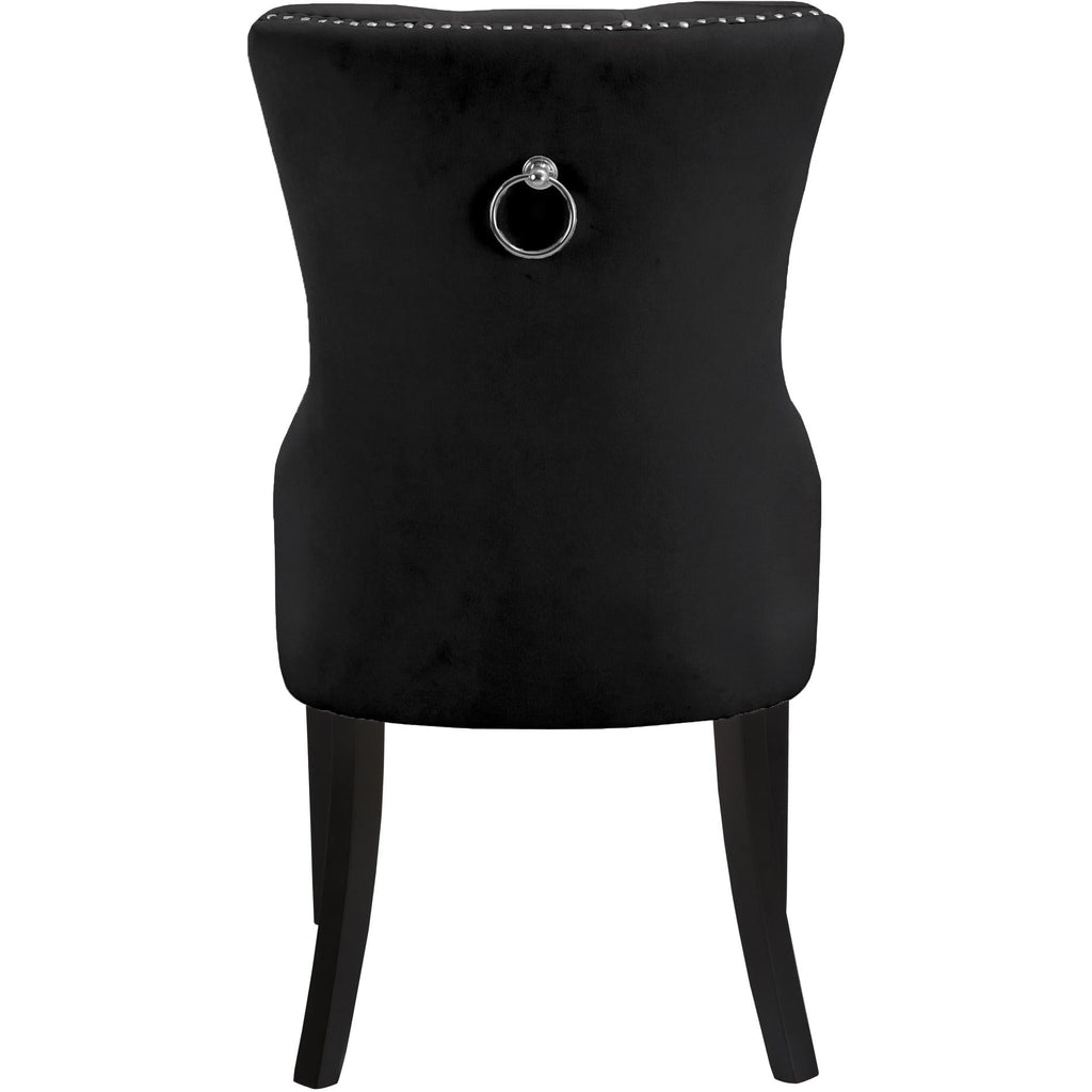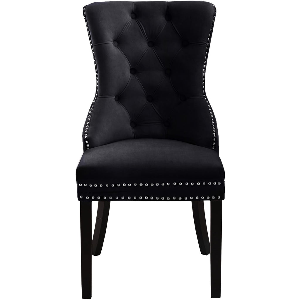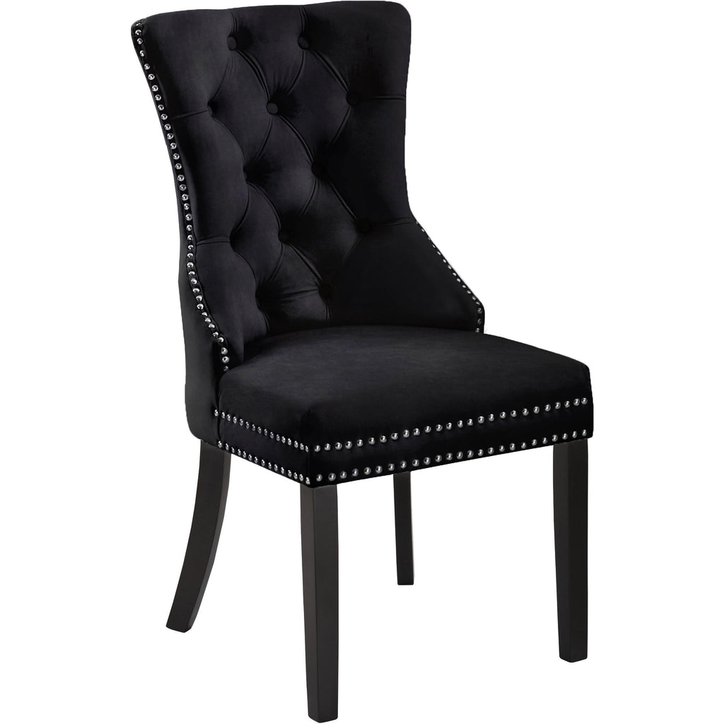 Dine in luxurious style with the Nikki black velvet dining chair. Featuring a curved high back, plush cushioned seat and deep tufted black velvet upholstery studded with chrome nailheads, this dining chair is sure to take your dining experience to a whole new level. Espresso wood legs provide sturdy support and complement the stunning black upholstery for a sleek, contemporary design.