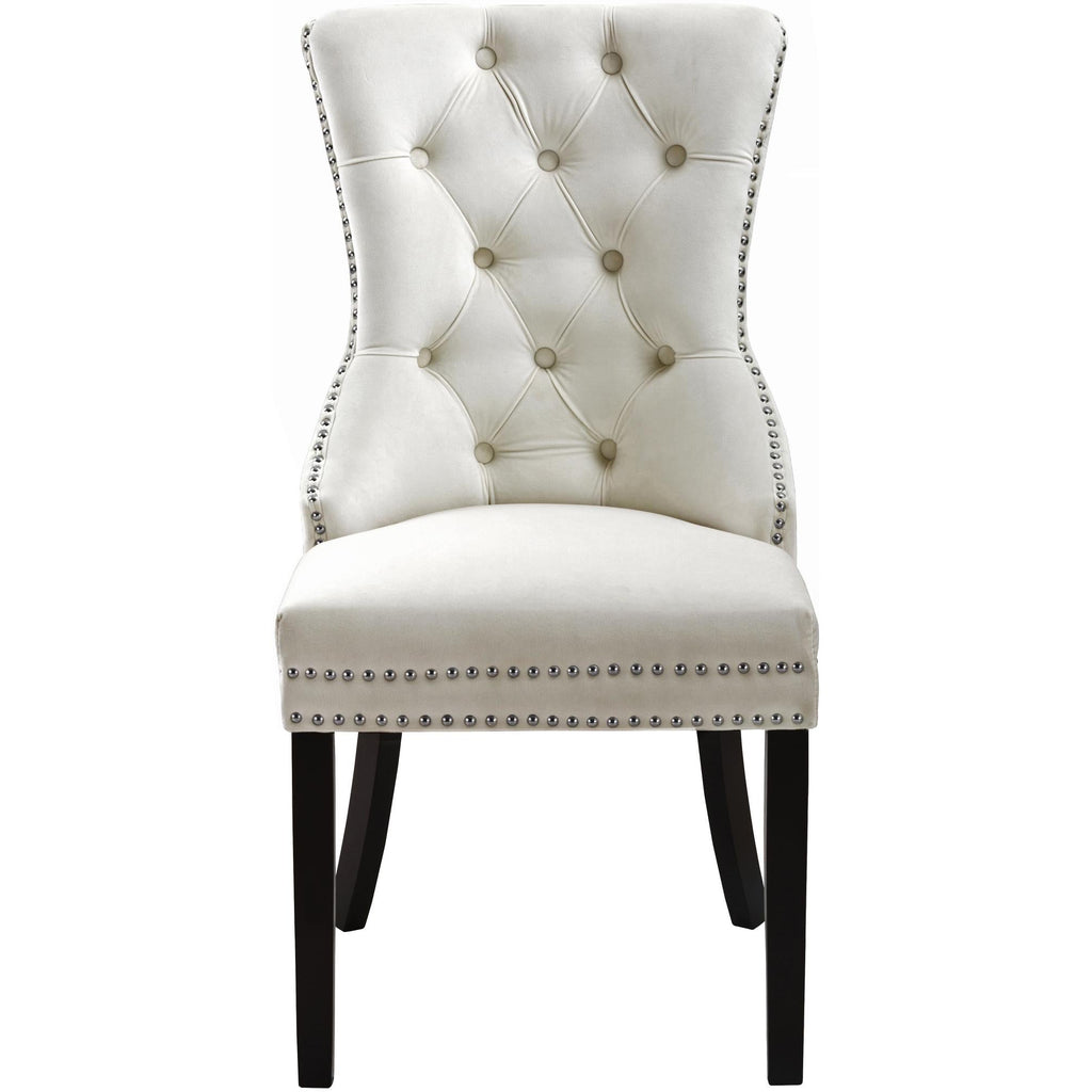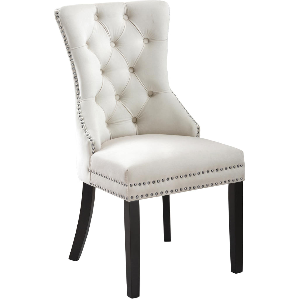 Dine in luxurious style with the Nikki cream velvet dining chair. Featuring a curved high back, plush cushioned seat and deep tufted cream velvet upholstery studded with chrome nailheads, this dining chair is sure to take your dining experience to a whole new level. Espresso wood legs provide sturdy support and complement the stunning cream upholstery for a sleek, contemporary design.