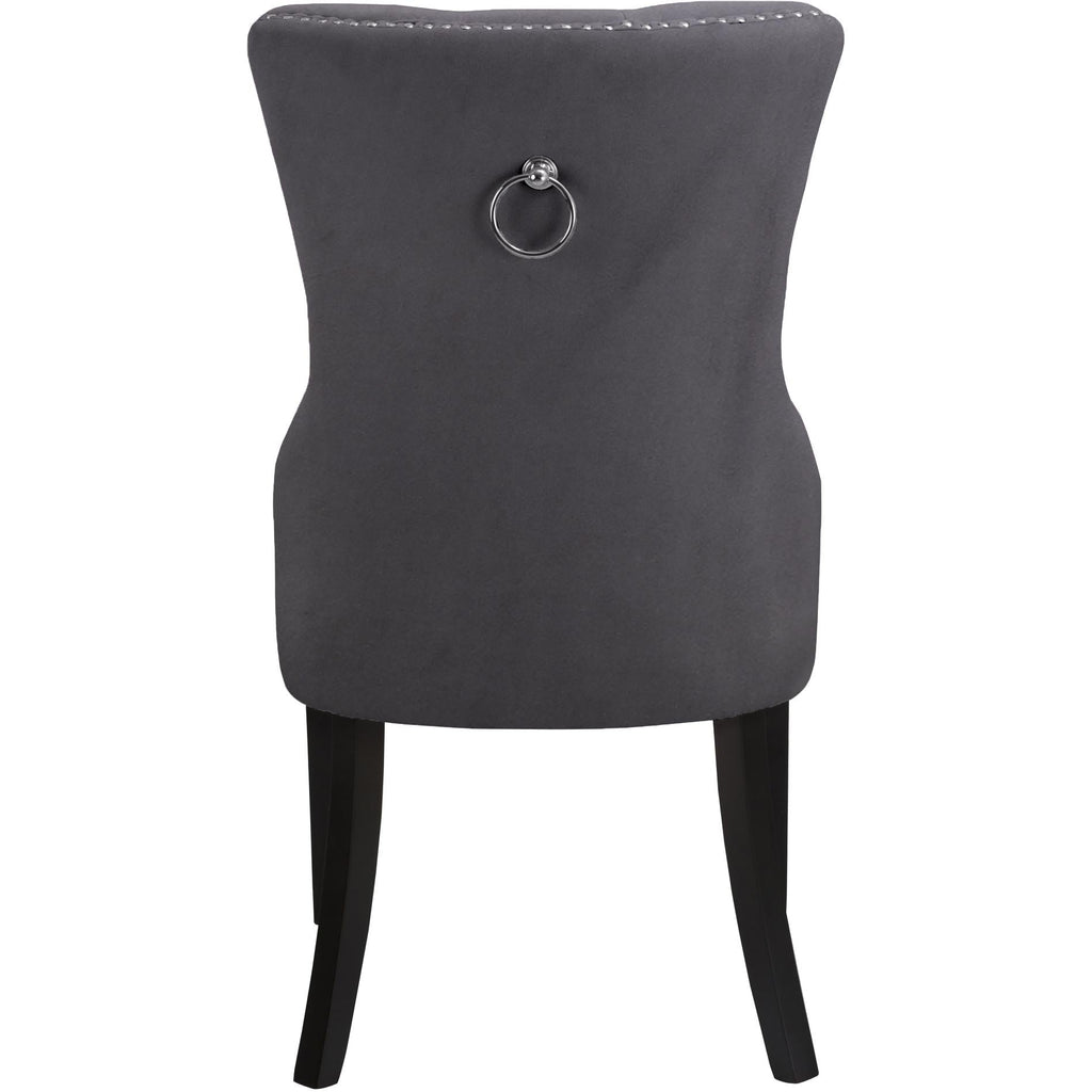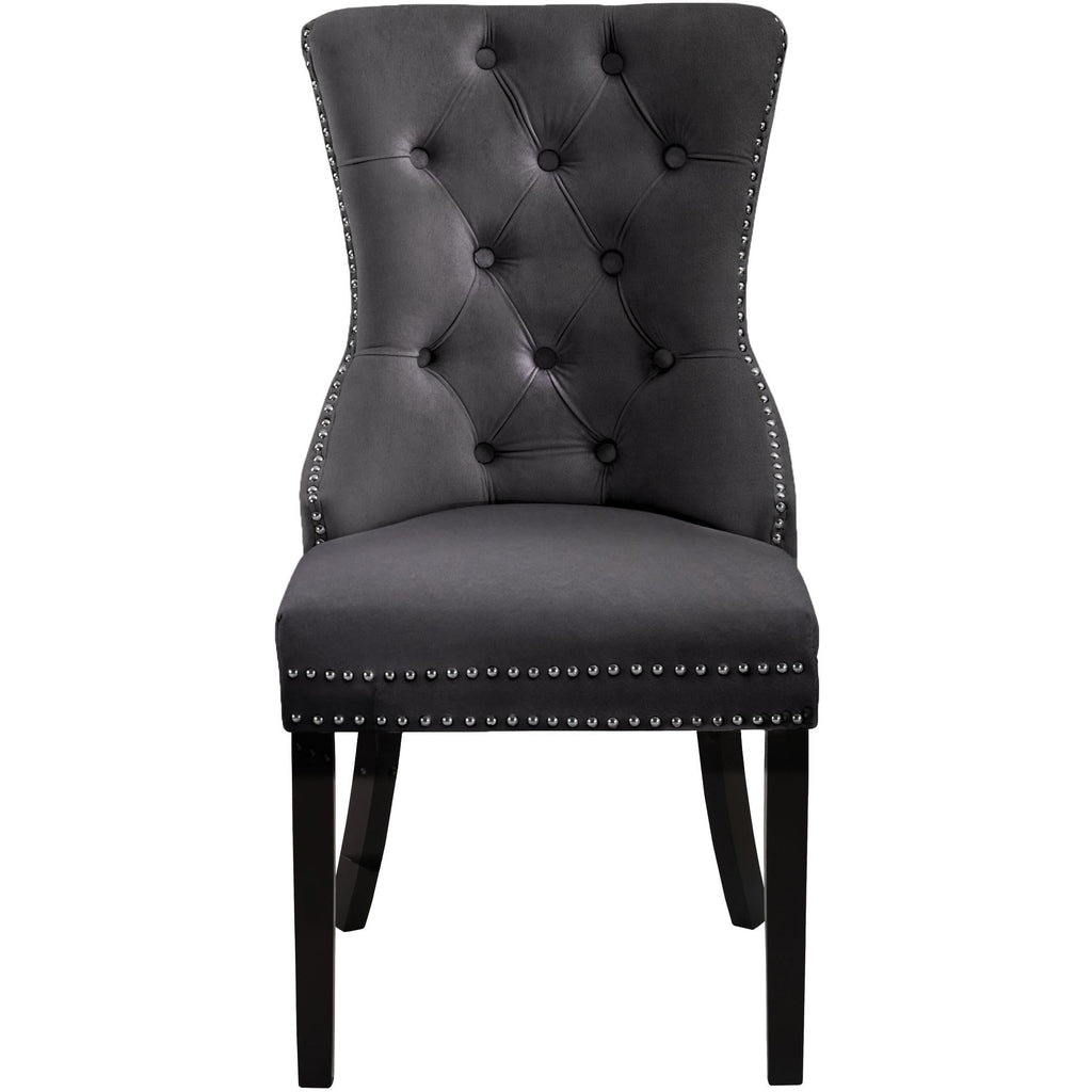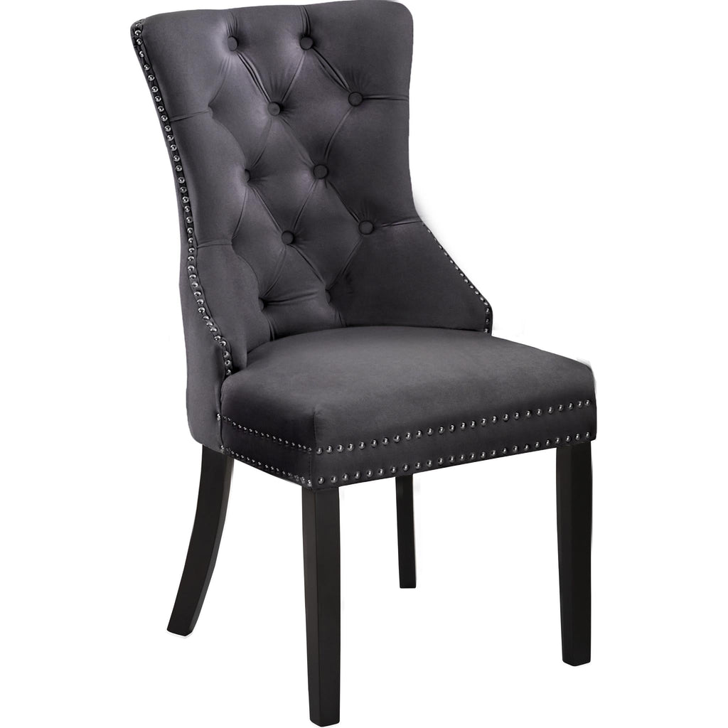 Dine in luxurious style with the Nikki grey velvet dining chair. Featuring a curved high back, plush cushioned seat and deep tufted grey velvet upholstery studded with chrome nailheads, this dining chair is sure to take your dining experience to a whole new level. Espresso wood legs provide sturdy support and complement the stunning grey upholstery for a sleek, contemporary design.