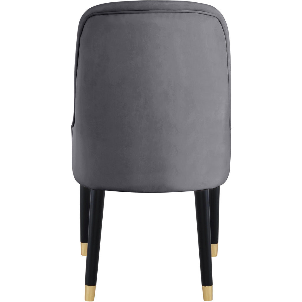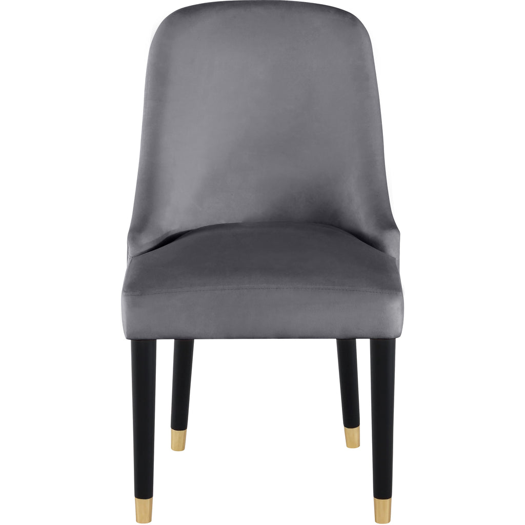 Welcoming comfort awaits you with this Omni velvet dining chair in a soft grey velvet design. Upholstered to the hilt in smooth, beckoning velvet, this chair features black wooden espresso legs topped in gold metal tips for a look that's both elegant and sophisticated. The rounded back and the thick and plump cushions add to the comfort factor of this exceptional seating option.