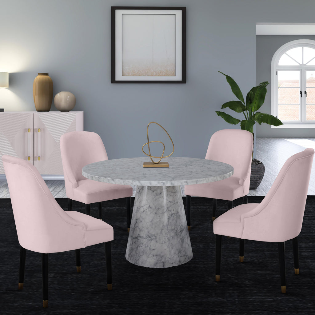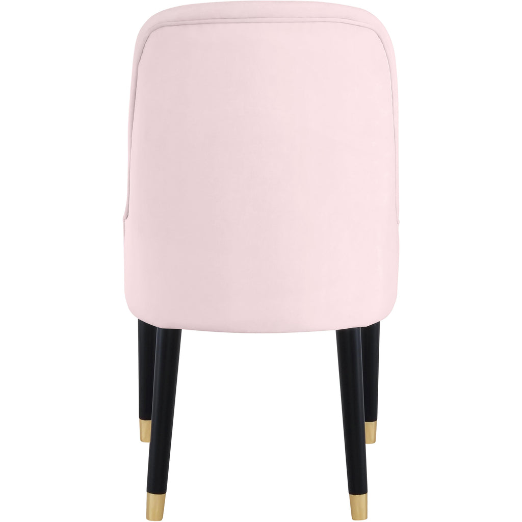 Welcoming comfort awaits you with this Omni velvet dining chair in a soft pink velvet design. Upholstered to the hilt in smooth, beckoning velvet, this chair features black wooden espresso legs topped in gold metal tips for a look that's both elegant and sophisticated. The rounded back and the thick and plump cushions add to the comfort factor of this exceptional seating option.