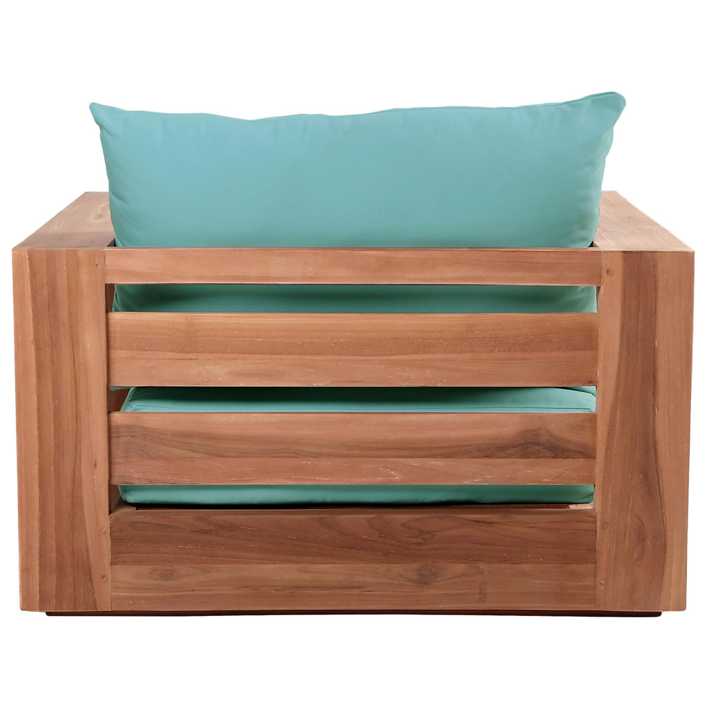 Make this Tulum teak outdoor patio chair the go to spot for relaxing and entertaining guest in your outdoor space. This chair features resilient water resistant sea blue fabric making it the perfect spot to rest your feet and enjoy the company of friends or family while you take in the sunrise. Teak construction makes it a tough addition for the patio or porch and gives it the longevity and durability it needs to weather the elements with beautiful ease. Pair it with other items from the Tulum collection for a look that impresses from every angle.