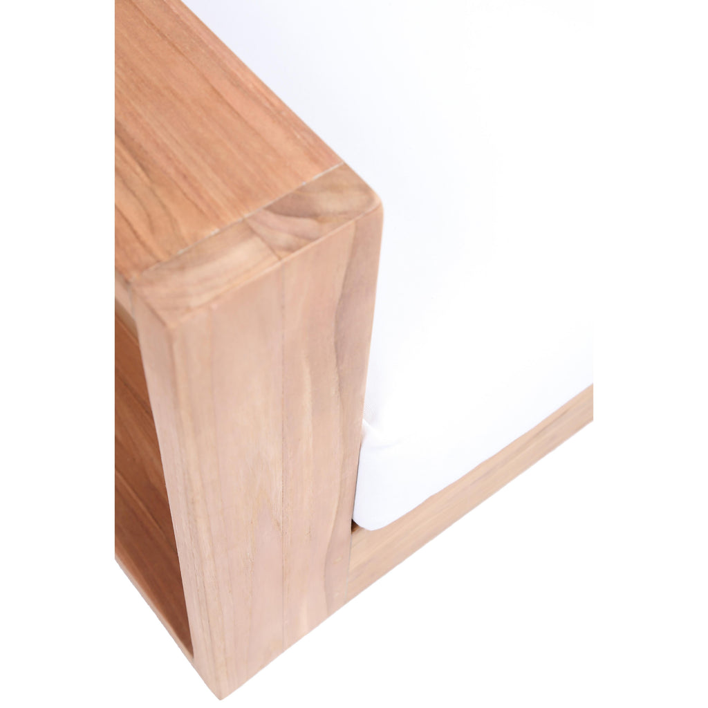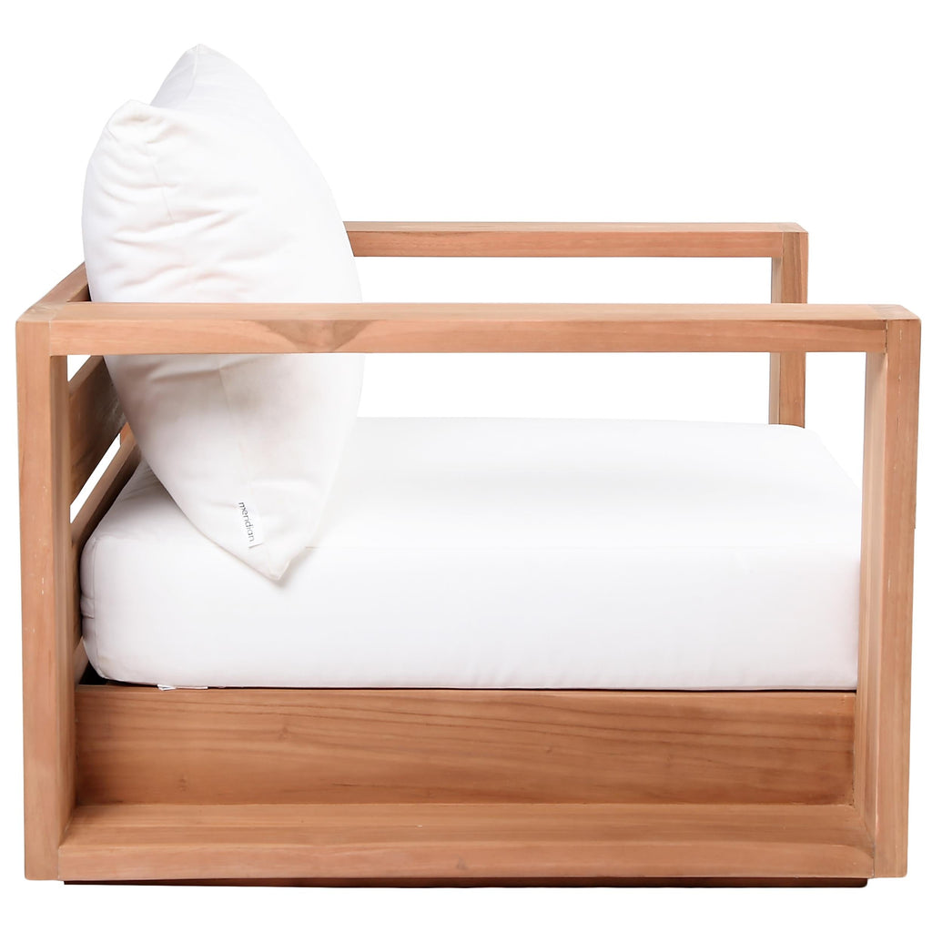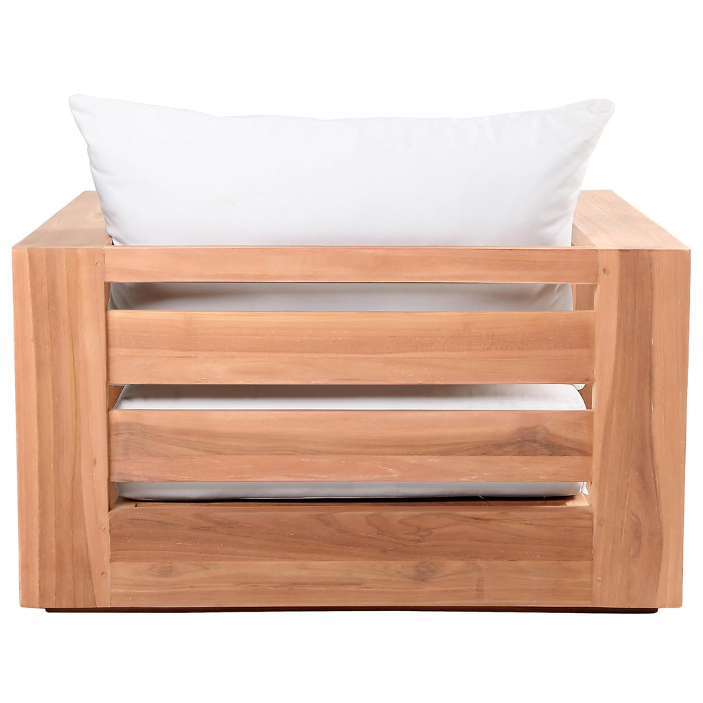 Make this Tulum teak outdoor patio chair the go to spot for relaxing and entertaining guest in your outdoor space. This chair features resilient water resistant white fabric making it the perfect spot to rest your feet and enjoy the company of friends or family while you take in the sunrise. Teak construction makes it a tough addition for the patio or porch and gives it the longevity and durability it needs to weather the elements with beautiful ease. Pair it with other items from the Tulum collection for a look that impresses from every angle.