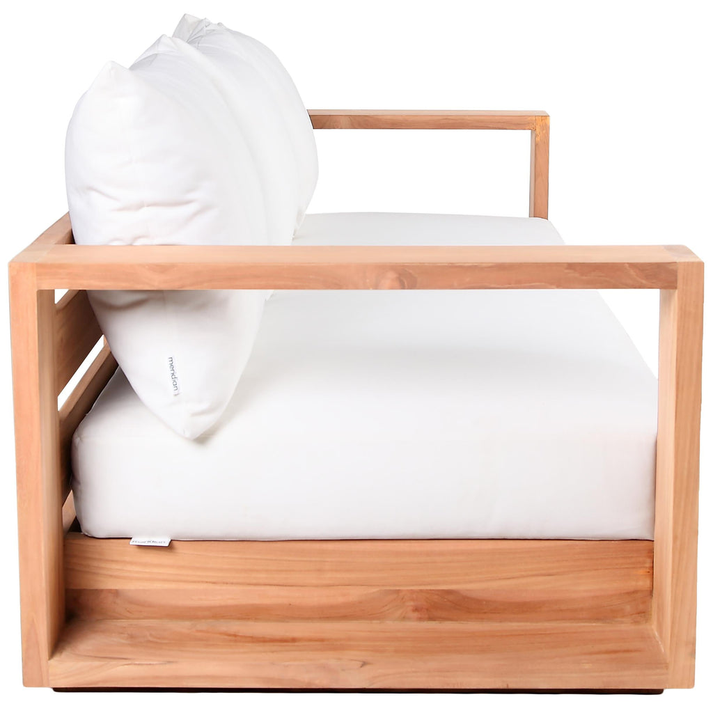 Make this Tulum teak outdoor patio sofa the go to spot for relaxing and entertaining guest in your outdoor space. This sofa features resilent water resistant white fabric making it the perfect spot to rest your feet and enjoy the company of friends or family while you take in the sunrise. Teak construction makes it a tough addition for the patio or porch and gives it the longevity and durability it needs to weather the elements with beautiful ease. Pair it with other items from the Tulum collection for a look that impresses from every angle.