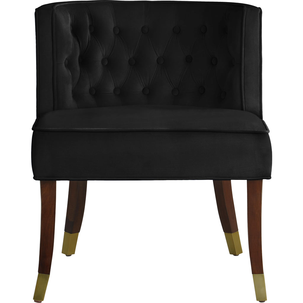 Make diners feel comfortable from the first course through dessert when you seat them in this Perry velvet dining chair. This handsome chair is covered in chic, plush black velvet and features a button-tufted back for an elegant look that impresses visitors and family alike. The chair sits on espresso wood legs with metal caps in brushed gold for added elegance and refinement.