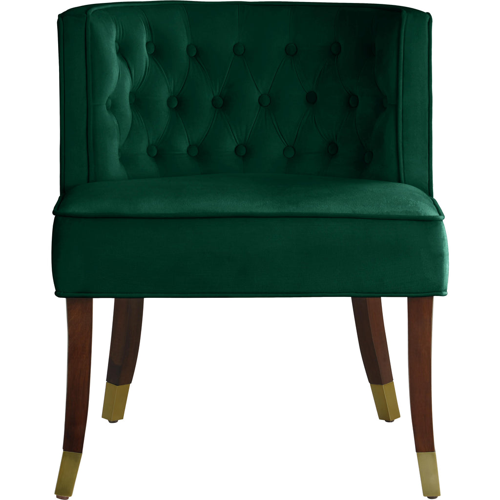 Make diners feel comfortable from the first course through dessert when you seat them in this Perry velvet dining chair. This handsome chair is covered in chic, plush green velvet and features a button-tufted back for an elegant look that impresses visitors and family alike. The chair sits on espresso wood legs with metal caps in brushed gold for added elegance and refinement.