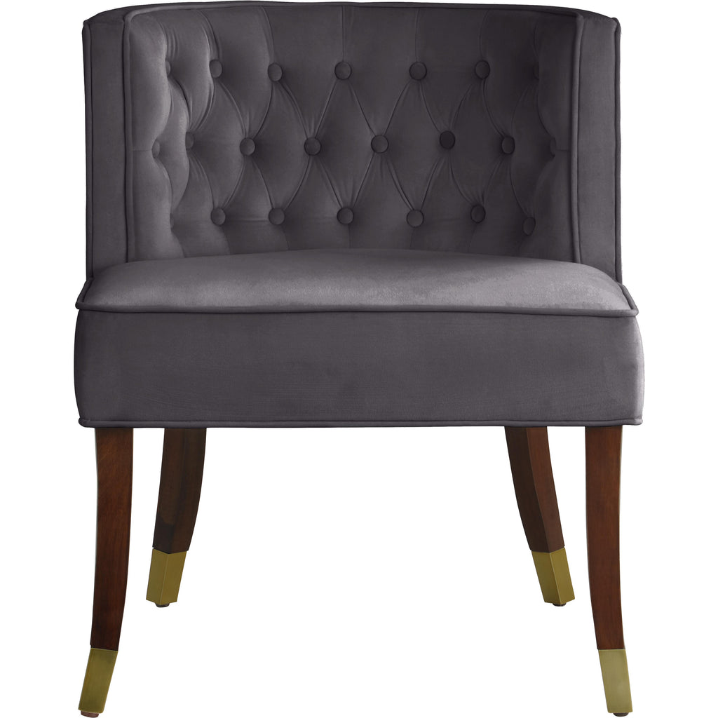 Make diners feel comfortable from the first course through dessert when you seat them in this Perry velvet dining chair. This handsome chair is covered in chic, plush grey velvet and features a button-tufted back for an elegant look that impresses visitors and family alike. The chair sits on espresso wood legs with metal caps in brushed gold for added elegance and refinement.
