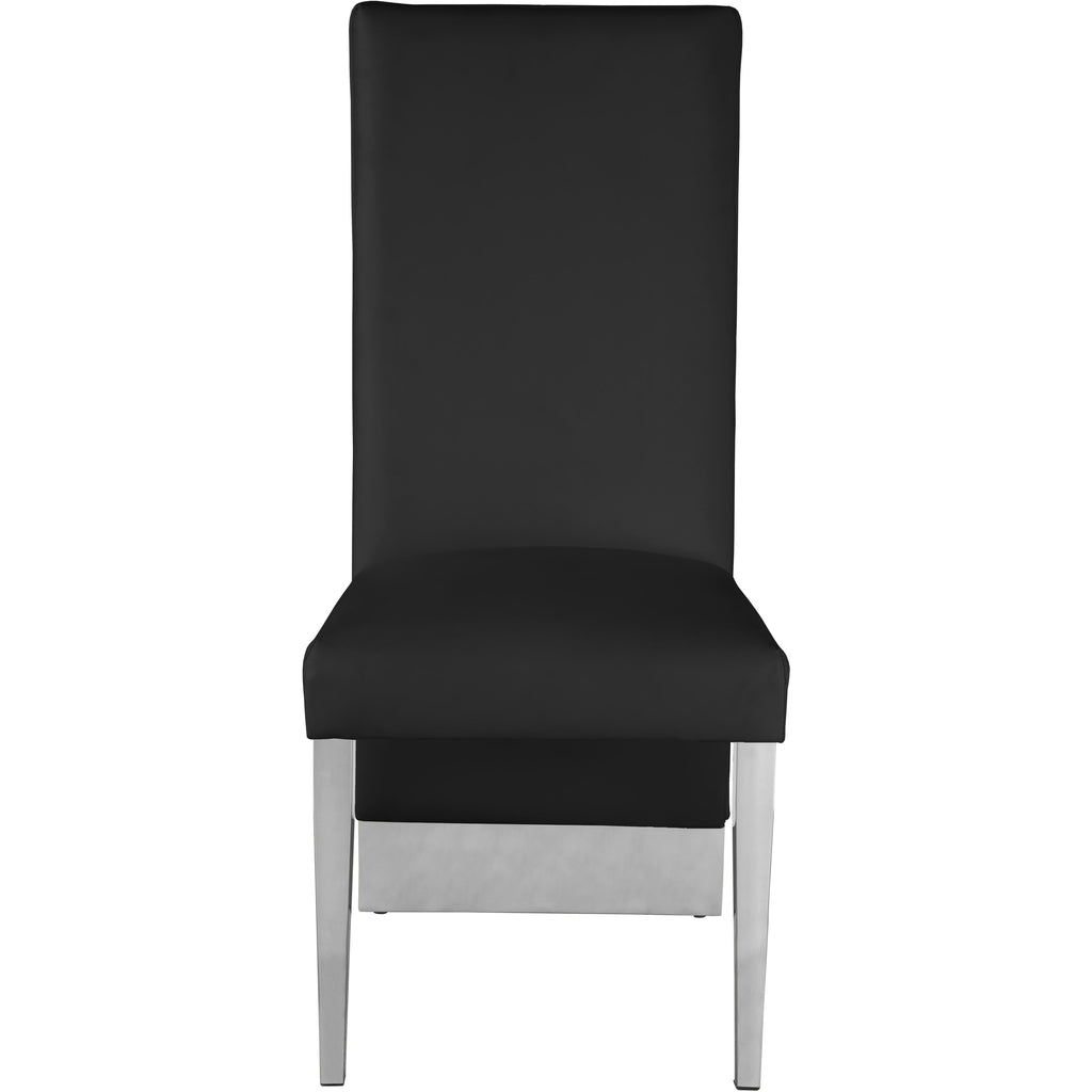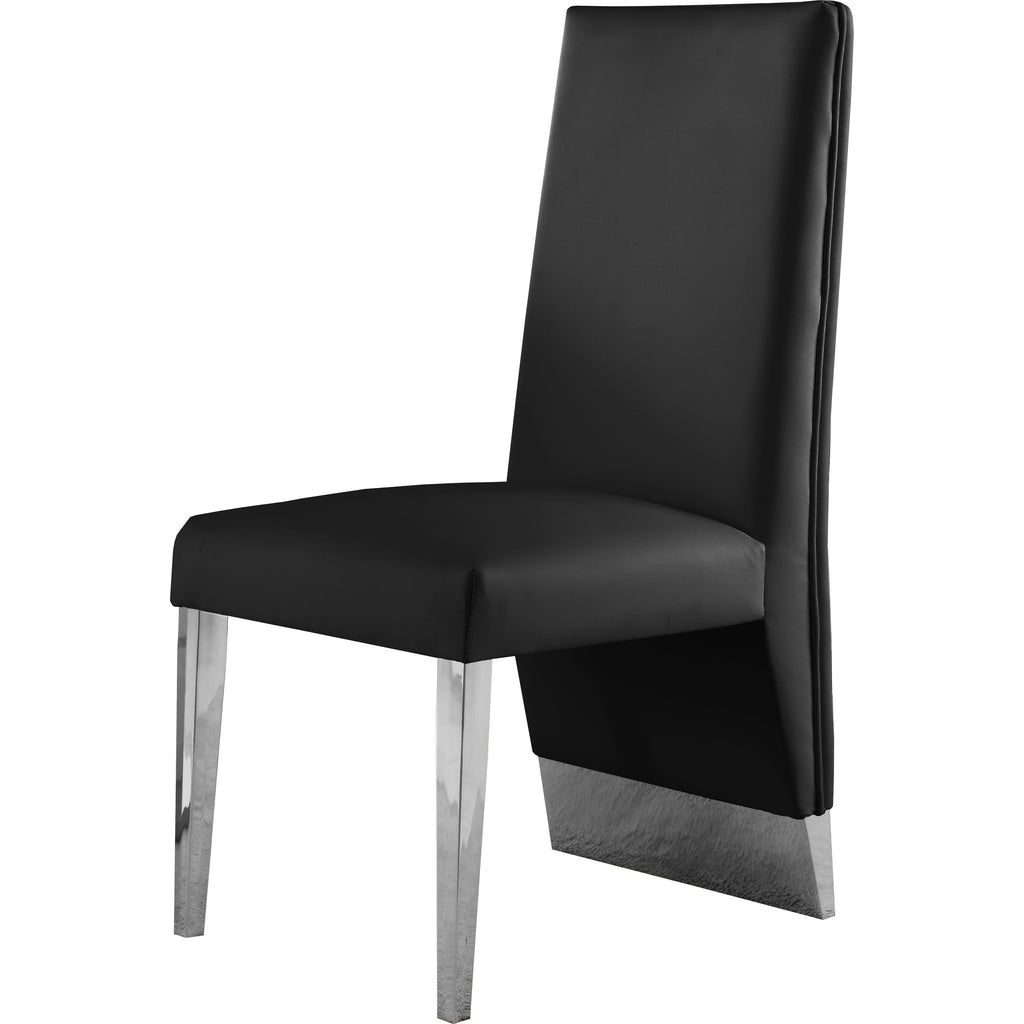 Bring the luxe look of this Porsha chair to your dining space. Impressing guests is simple when they're seated in this chair. The floor-length back is elegantly beautiful and creates a striking silhouette from every angle. Vegan Leather upholstery material in a sophisticated hue of black adds a touch of modernity to this chair, and the reverse is channel tufted for added elegance and refinement. Chrome legs complete the look for added contemporary panache and sturdy support.