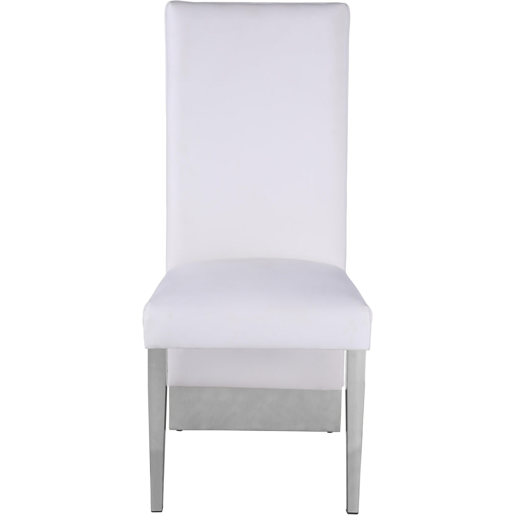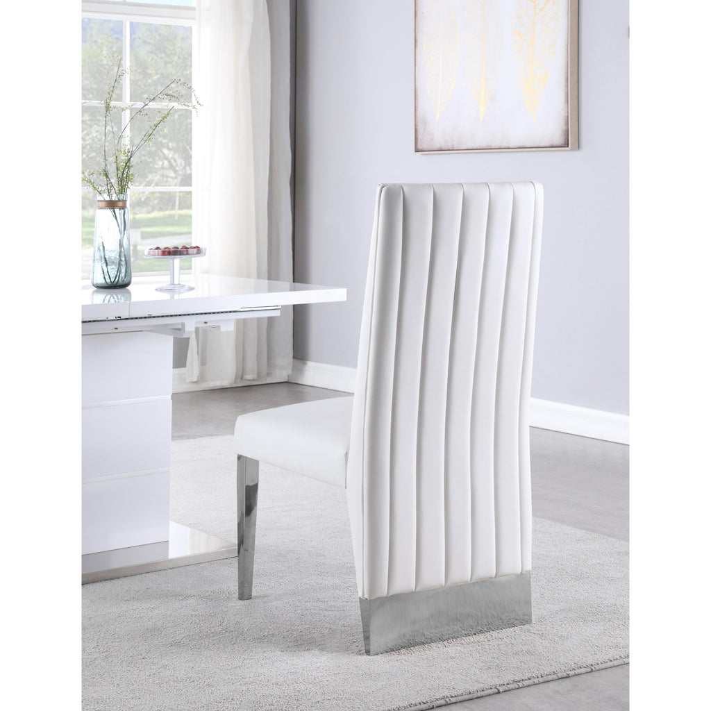 Bring the luxe look of this Porsha chair to your dining space. Impressing guests is simple when they're seated in this chair. The floor-length back is elegantly beautiful and creates a striking silhouette from every angle. Vegan Leather upholstery material in a sophisticated hue of white adds a touch of modernity to this chair, and the reverse is channel tufted for added elegance and refinement. Chrome legs complete the look for added contemporary panache and sturdy support.