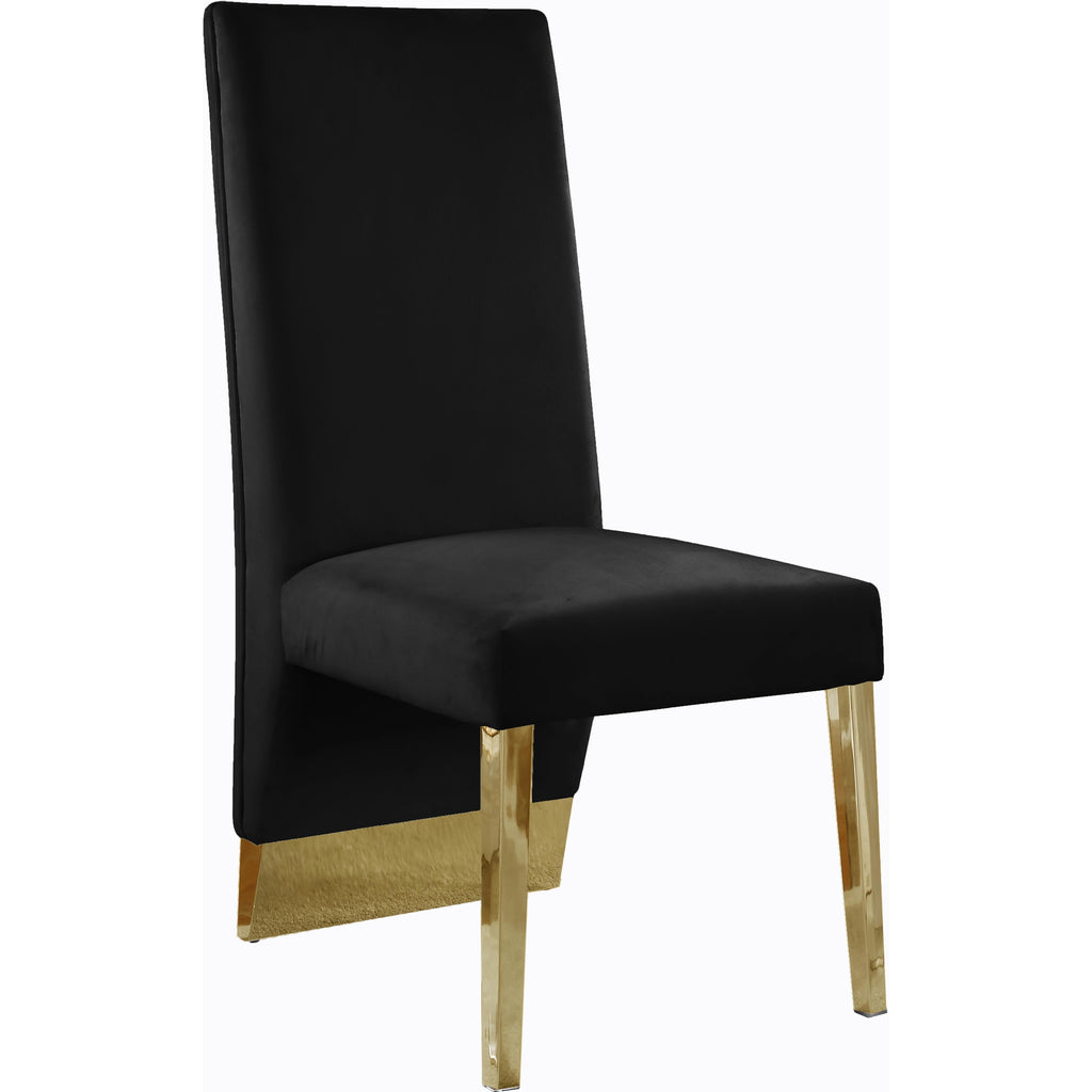 Bring the luxe look of this Porsha chair to your dining space. Impressing guests is simple when they're seated in this chair. The floor-length back is elegantly beautiful and creates a striking silhouette from every angle. Velvet upholstery material in a sophisticated hue of black adds a touch of modernity to this chair, and the reverse is channel tufted for added elegance and refinement. Gold legs complete the look for added contemporary panache and sturdy support.
