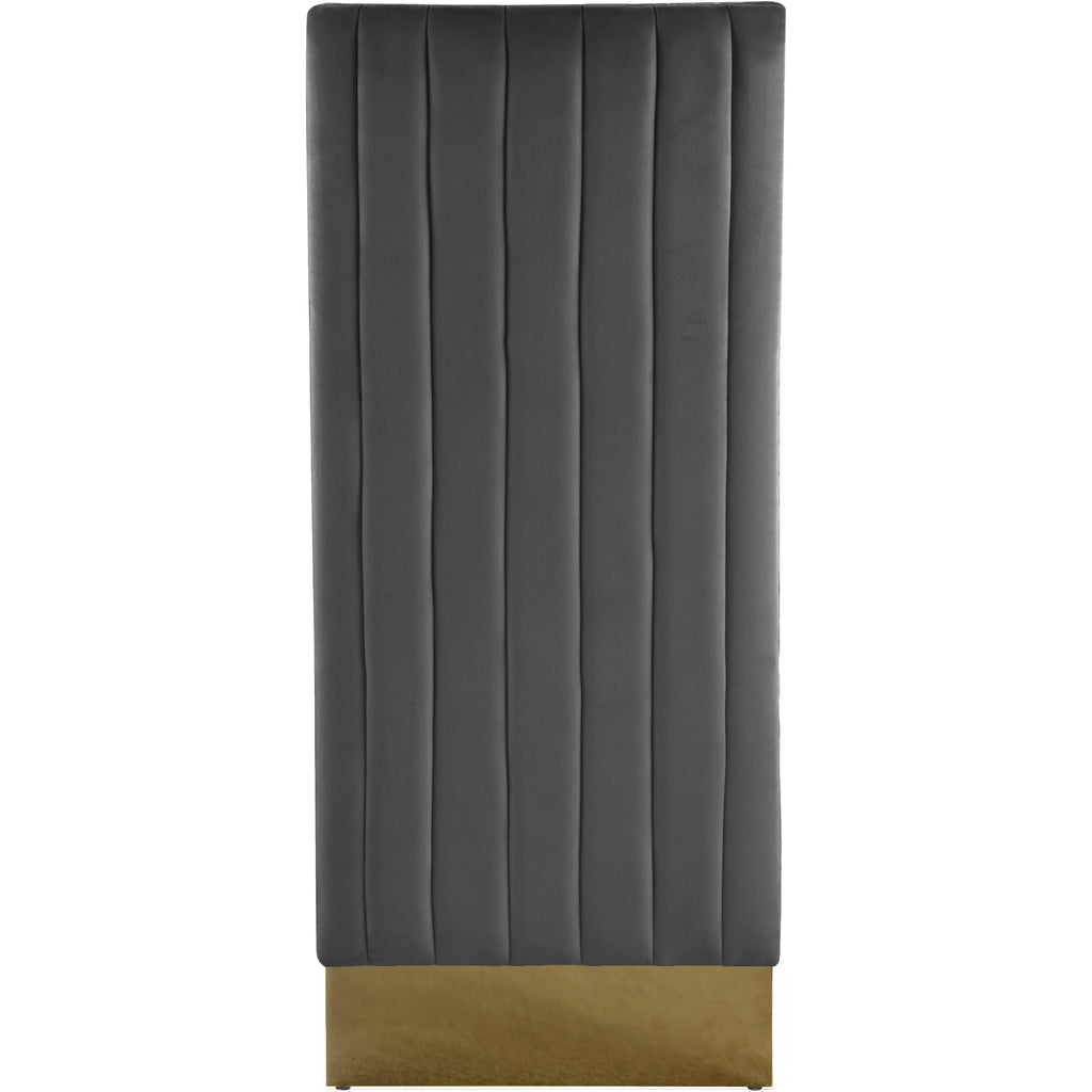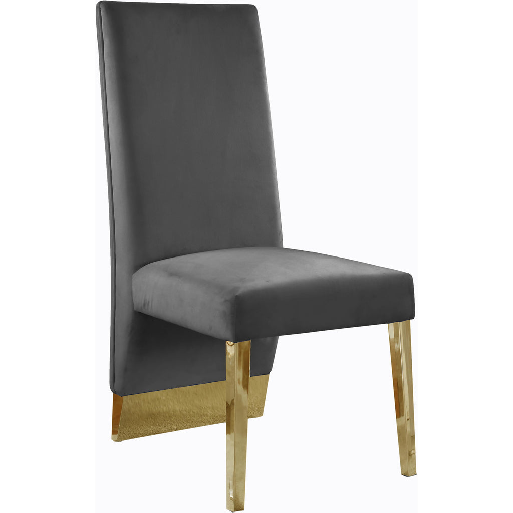 Bring the luxe look of this Porsha chair to your dining space. Impressing guests is simple when they're seated in this chair. The floor-length back is elegantly beautiful and creates a striking silhouette from every angle. Velvet upholstery material in a sophisticated hue of grey adds a touch of modernity to this chair, and the reverse is channel tufted for added elegance and refinement. Gold legs complete the look for added contemporary panache and sturdy support.