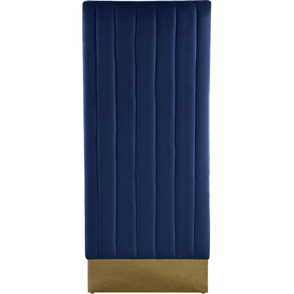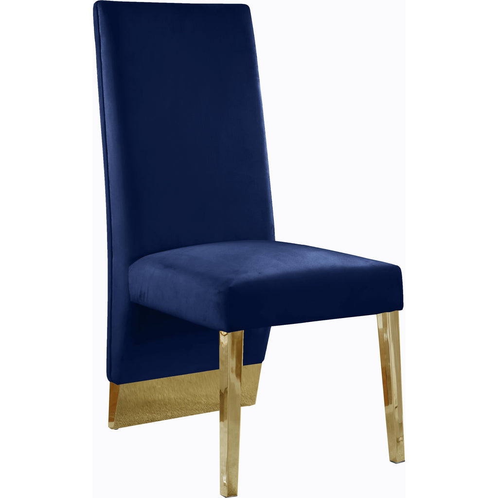 Bring the luxe look of this Porsha chair to your dining space. Impressing guests is simple when they're seated in this chair. The floor-length back is elegantly beautiful and creates a striking silhouette from every angle. Velvet upholstery material in a sophisticated hue of navy adds a touch of modernity to this chair, and the reverse is channel tufted for added elegance and refinement. Gold legs complete the look for added contemporary panache and sturdy support.