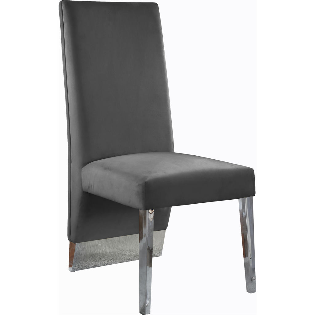 Set the standard for elegance in your dining room with this Porsha Dining Chair. A high back design with a slight slant creates an enviable silhouette and air of sophistication. Velvet upholstery in a neutral shade of grey adds to the beautiful look of this exquisite chair. Channel tufting keeps the soft padding of the chair aloft, so it retains its comfort factor through repeat use. Chrome metal legs finish up the design, providing sturdy support and a modern edge.