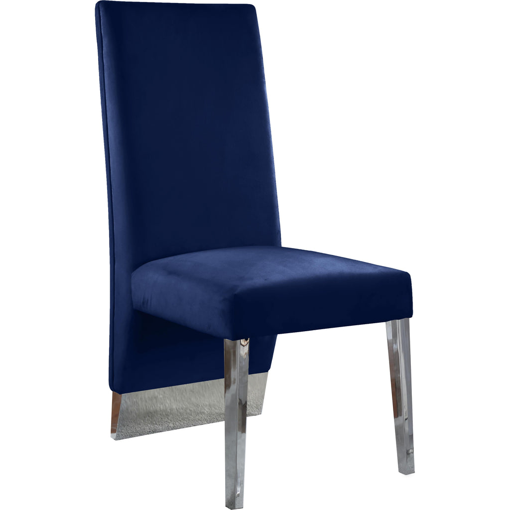 Set the standard for elegance in your dining room with this Porsha Dining Chair. A high back design with a slight slant creates an enviable silhouette and air of sophistication. Velvet upholstery in a rich shade of navy adds to the beautiful look of this exquisite chair. Channel tufting keeps the soft padding of the chair aloft, so it retains its comfort factor through repeat use. Chrome metal legs finish up the design, providing sturdy support and a modern edge.