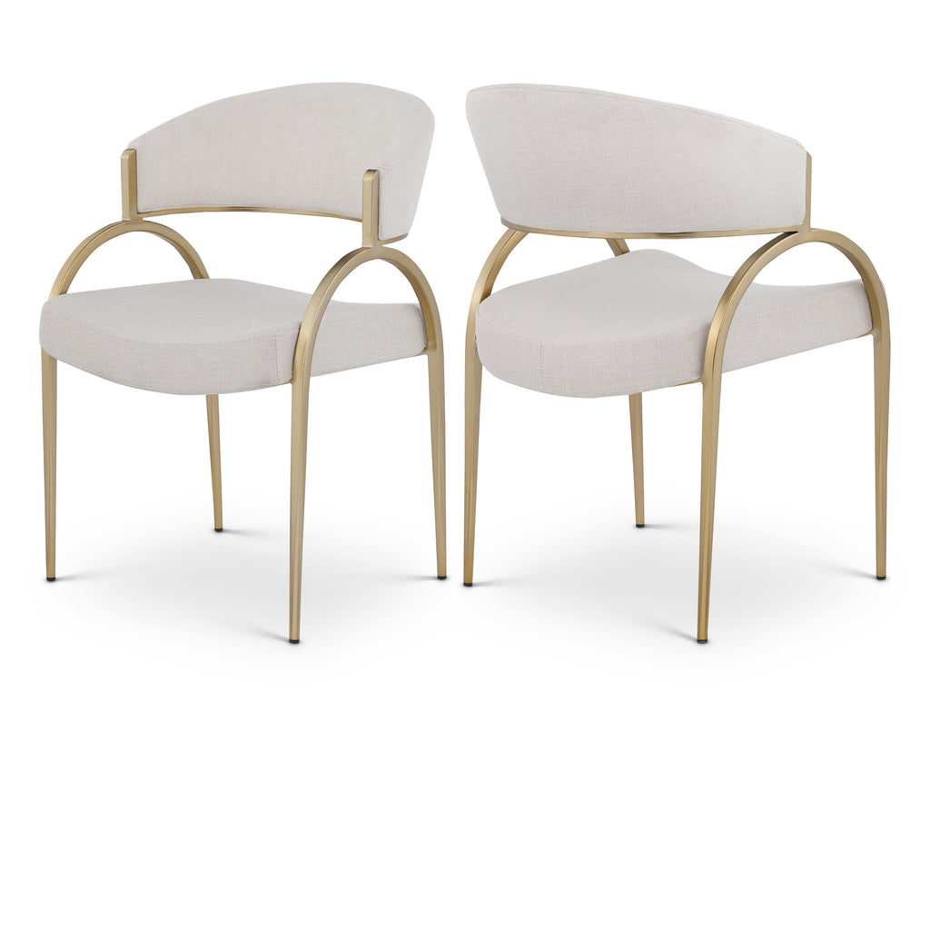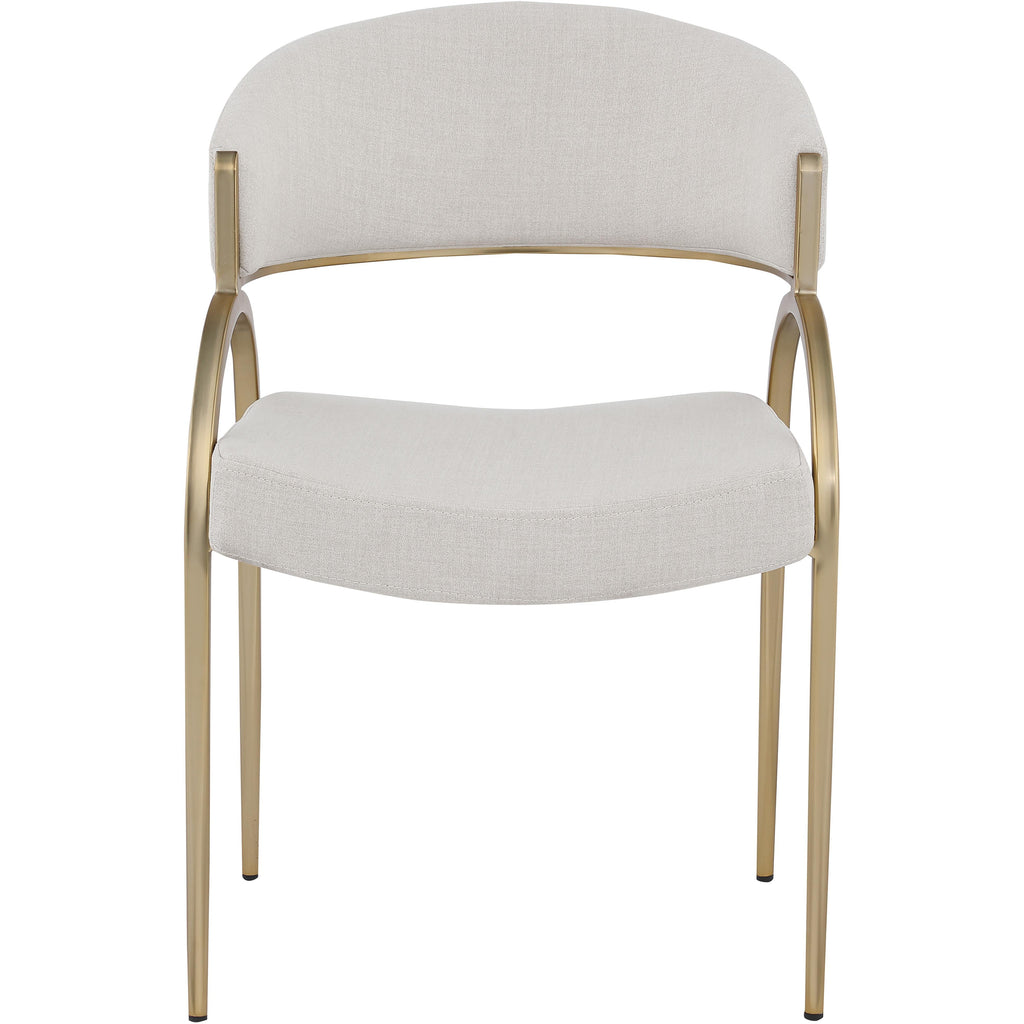 Give your dining room a touch of sophistication with this stunning beige Privet dining chair from Meridian Furniture. Its contemporary frame is comprised of iron, plate, foam, and fabric, with a brushed brass finish that shines. Soft beige linen-like polyester fabric upholsters the seat and back rest, providing you with a comfortable place to sit and relax while you dine with family and friends. Its contemporary design is perfect for any modern home.