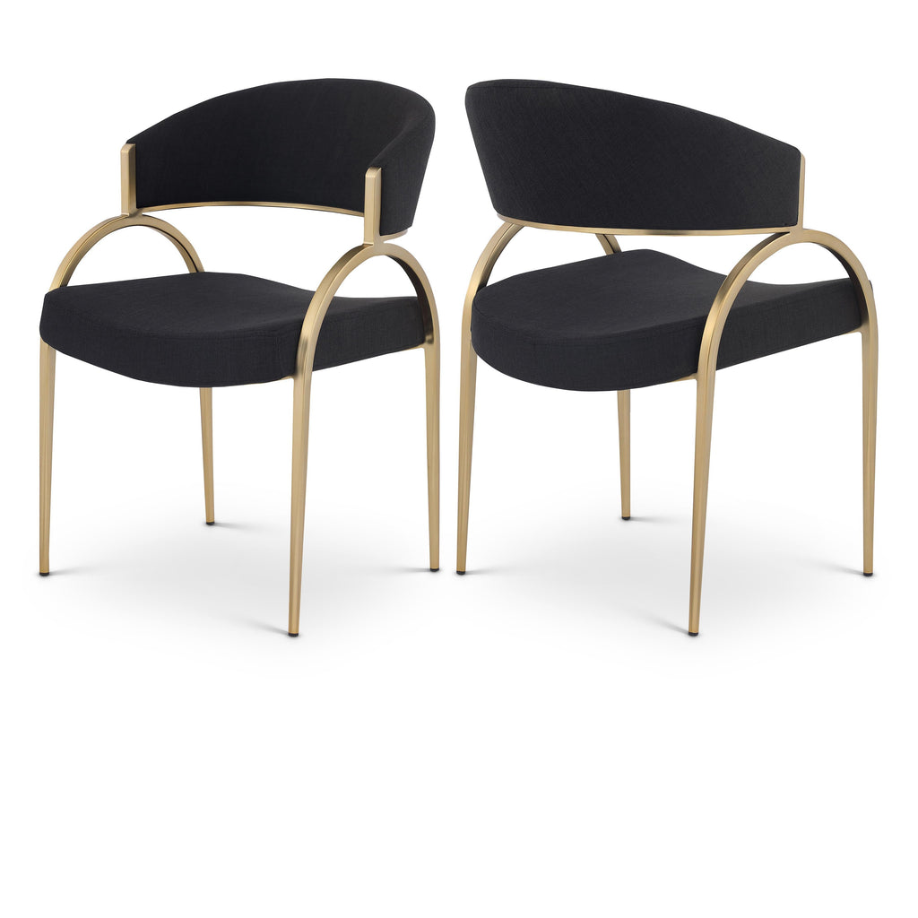 Give your dining room a touch of sophistication with this stunning black Privet dining chair from Meridian Furniture. Its contemporary frame is comprised of iron, plate, foam, and fabric, with a brushed brass finish that shines. Soft black linen-like polyester fabric upholsters the seat and back rest, providing you with a comfortable place to sit and relax while you dine with family and friends. Its contemporary design is perfect for any modern home.