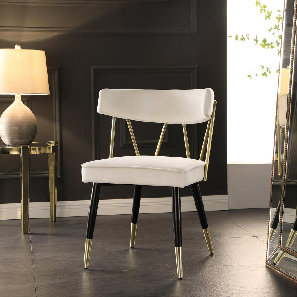 Make every dinner guest feel like a VIP with this Rheingold velvet dining chair. Part work of art, part functional, utilitarian seating option, this handsome Rheingold chair features soft cream velvet upholstery on the seat and back cushions for sleek and chic comfort. The chair's black metal legs with gold tips are beautiful to behold and give the chair a durable slant that makes it tough enough for daily use.