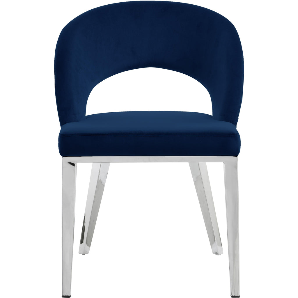 Seat dinner guests in elegant style with the Roberto navy velvet dining chair from Meridian Furniture. This fabulous chair features a rounded back with strategically placed opening for visual beauty and to allow air flow while you dine. The rich navy blue upholstery is chic and modern, and it has a soft feel against the skin. This chair rests on iron legs for superb support, and each leg is finished in chrome for a modish slant that meshes well with your up-to-the-minute dining room decor.