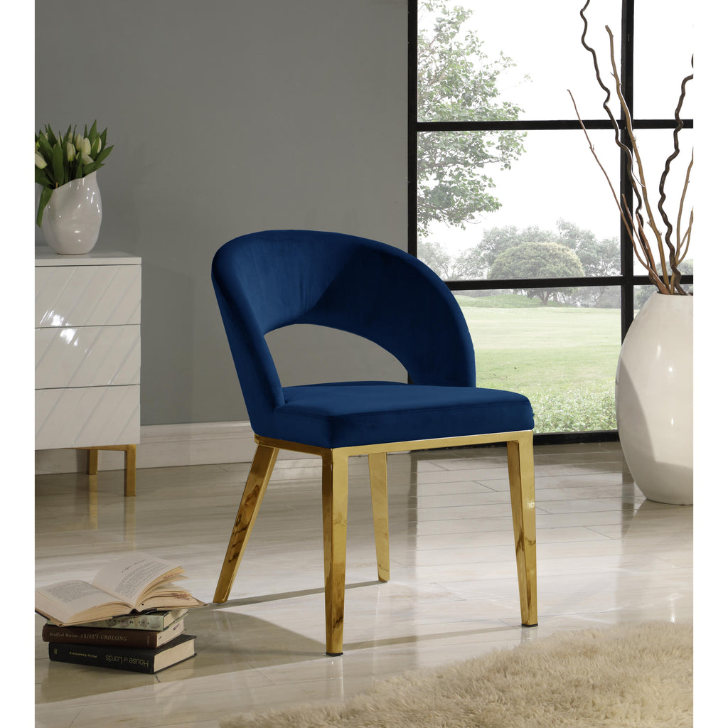 Seat dinner guests in elegant style with the Roberto navy velvet dining chair from Meridian Furniture. This fabulous chair features a rounded back with strategically placed opening for visual beauty and to allow air flow while you dine. The rich navy upholstery is chic and modern, and it has a soft feel against the skin. This chair rests on iron legs for superb support, and each leg is finished in gold for a modish slant that meshes well with your up-to-the-minute dining room decor.