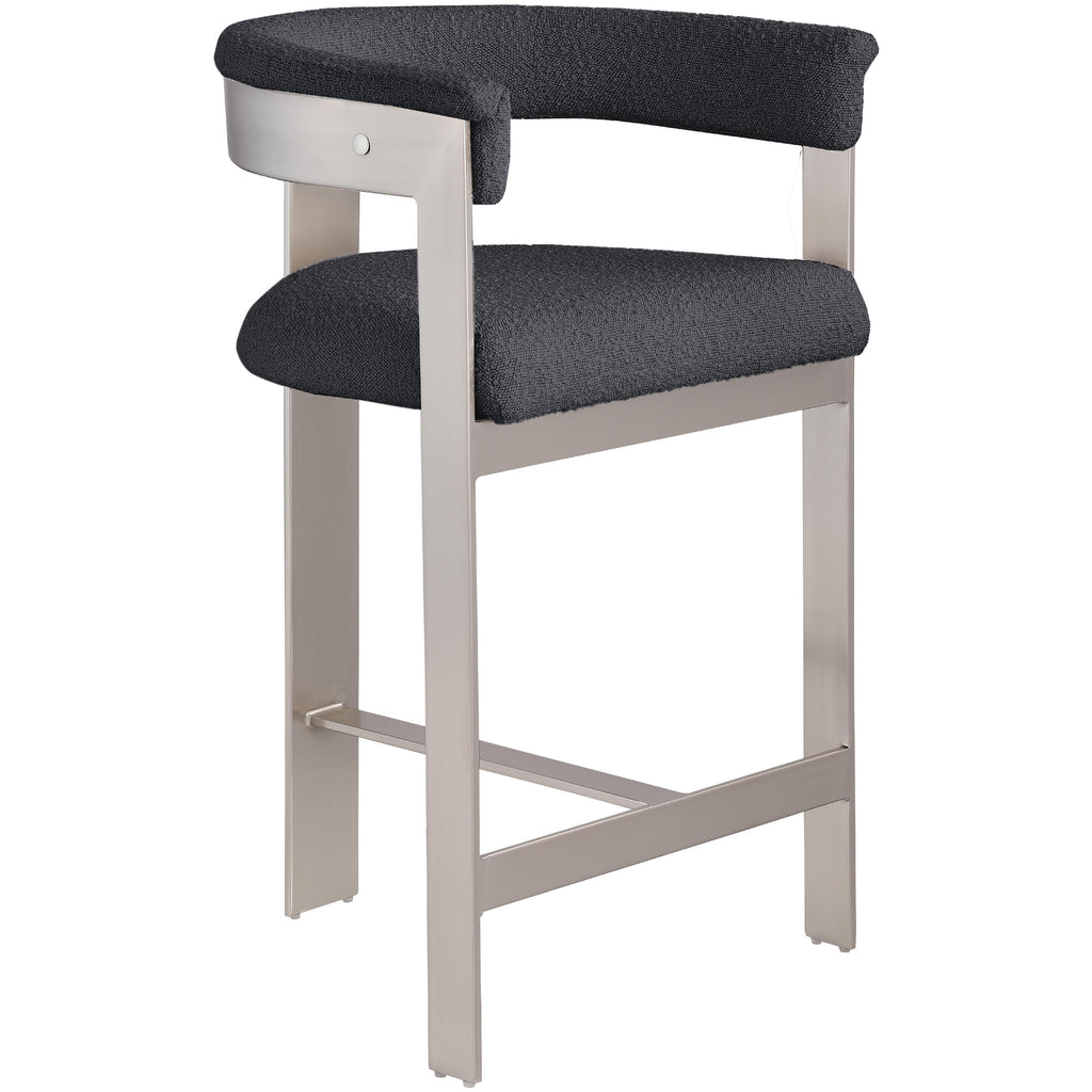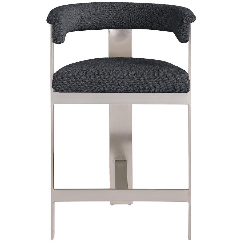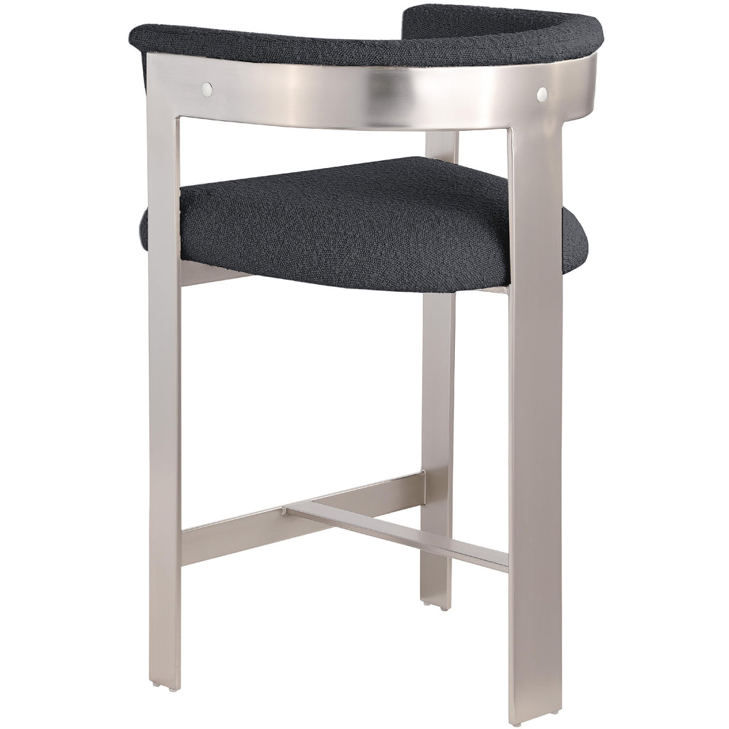 Enjoy an elevated dining experience when you bring home this black Romeo boucle counter stool. Featuring seats and backs upholstered in soft black boucle fabric, this stool offers both style and comfort. The brushed chrome metal frames add a contemporary touch, making this stool a chic addition to your dining area. The curved backs provide not only a sleek look but also optimal support for the body, ensuring diners are relaxed from appetizers through dessert.