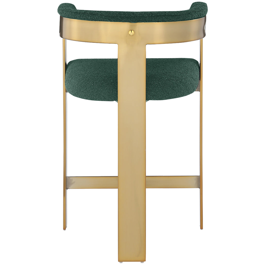 Choose these green Romeo boucle stool to give your dining room an instant refresh. These stools feature green boucle upholstered seats and backs, adding a modern touch to your space. The brushed gold metal frames offer an elegant contrast while ensuring durability. With sleek curved backs, these stools ensure comfort while enjoying a refreshing drink or meal. A cozy, chic seating solution for you and your guests, this stool will elevate any room's look.