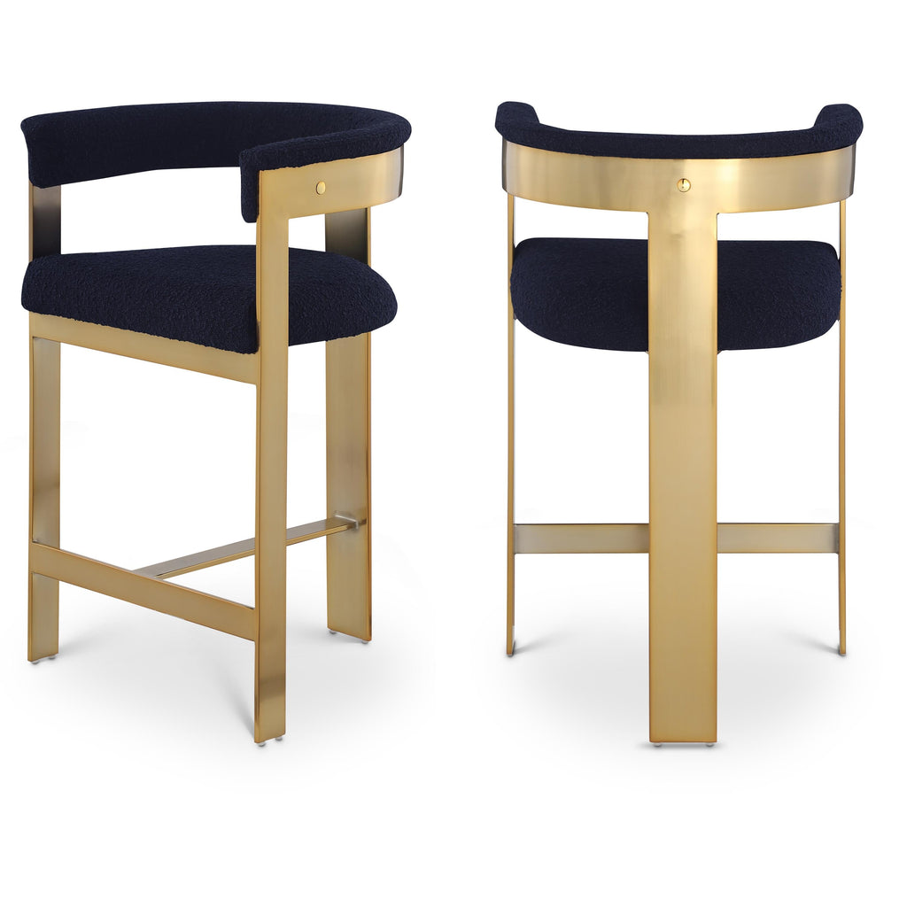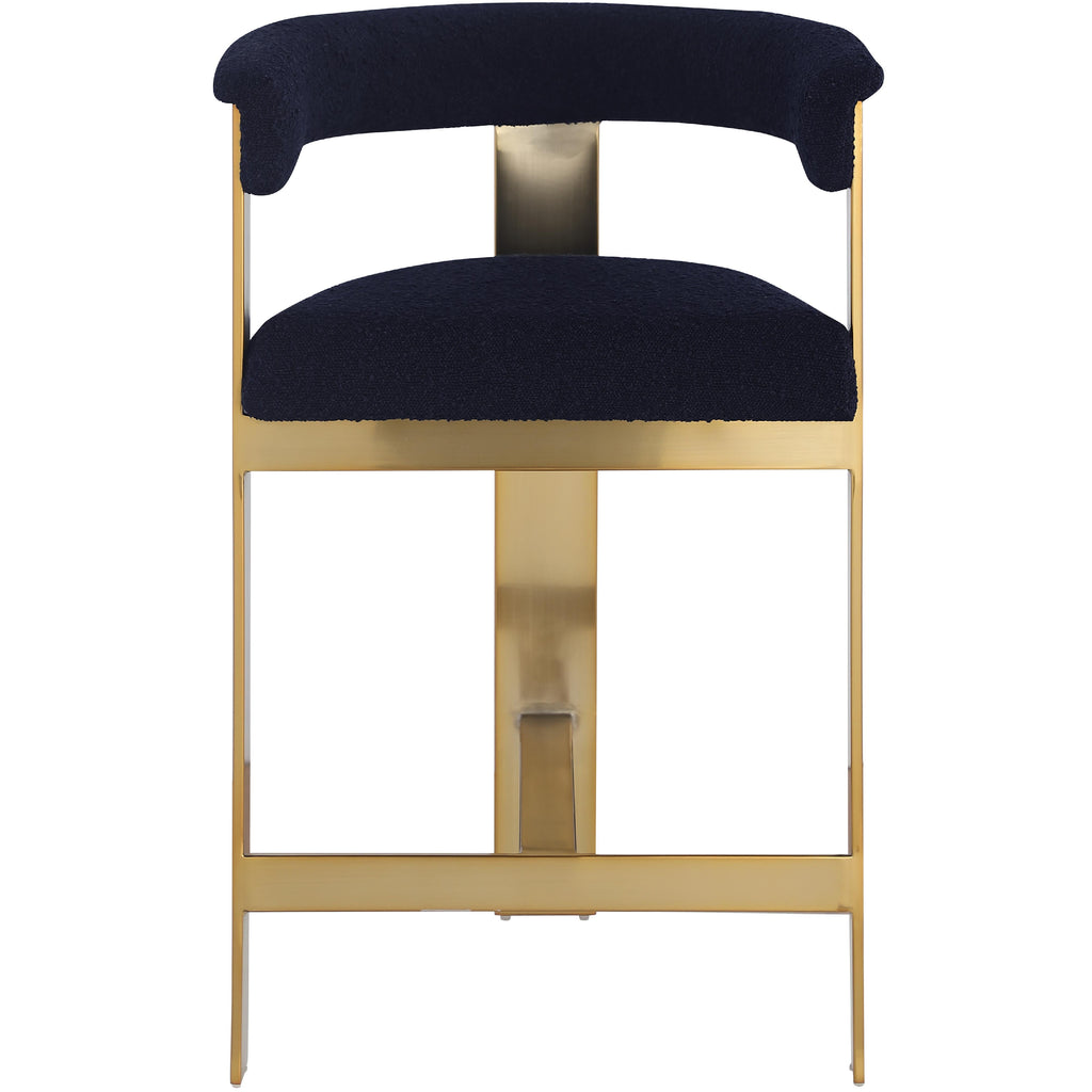 Choose these navy Romeo boucle stool to give your dining room an instant refresh. These stools feature navy boucle upholstered seats and backs, adding a modern touch to your space. The brushed gold metal frames offer an elegant contrast while ensuring durability. With sleek curved backs, these stools ensure comfort while enjoying a refreshing drink or meal. A cozy, chic seating solution for you and your guests, this stool will elevate any room's look.