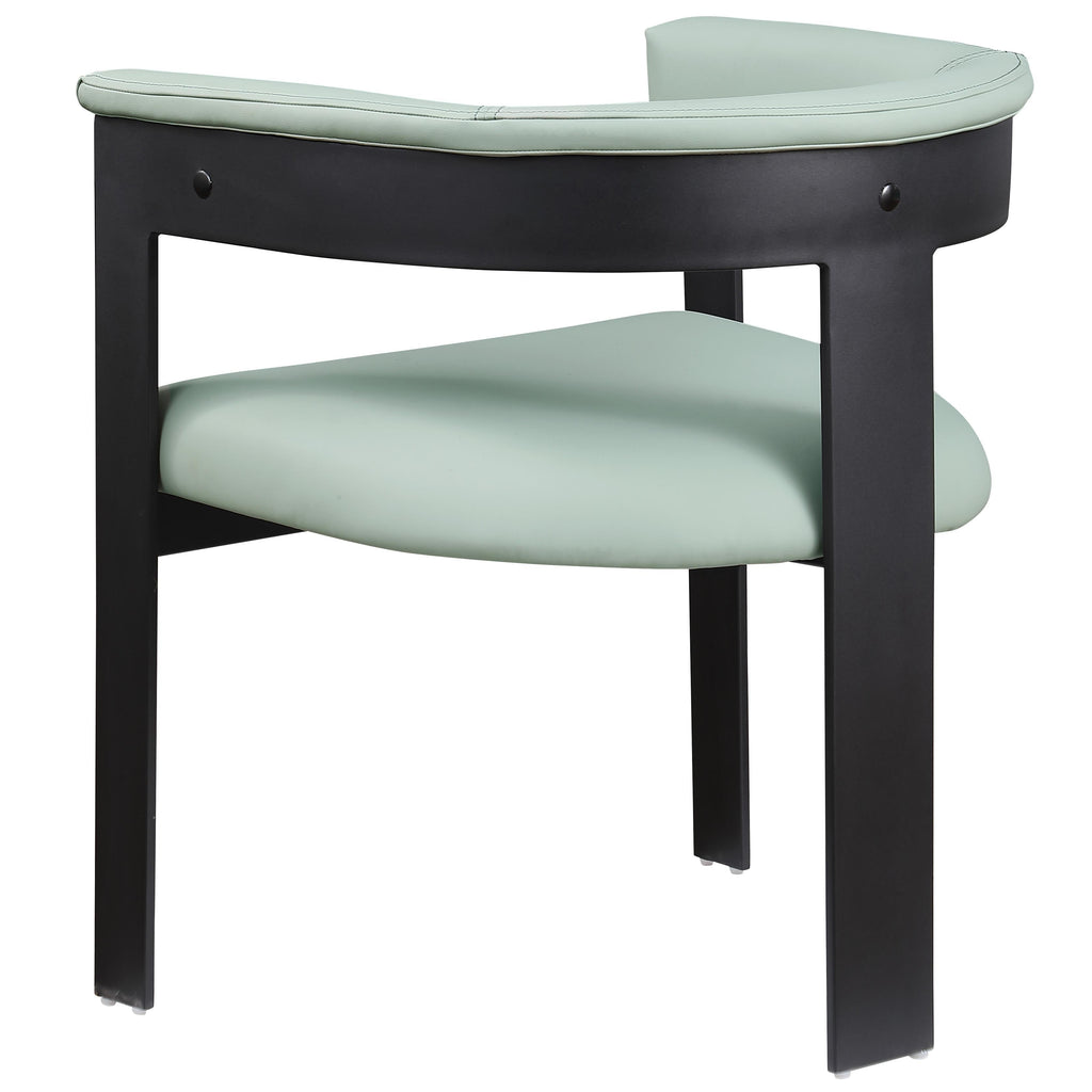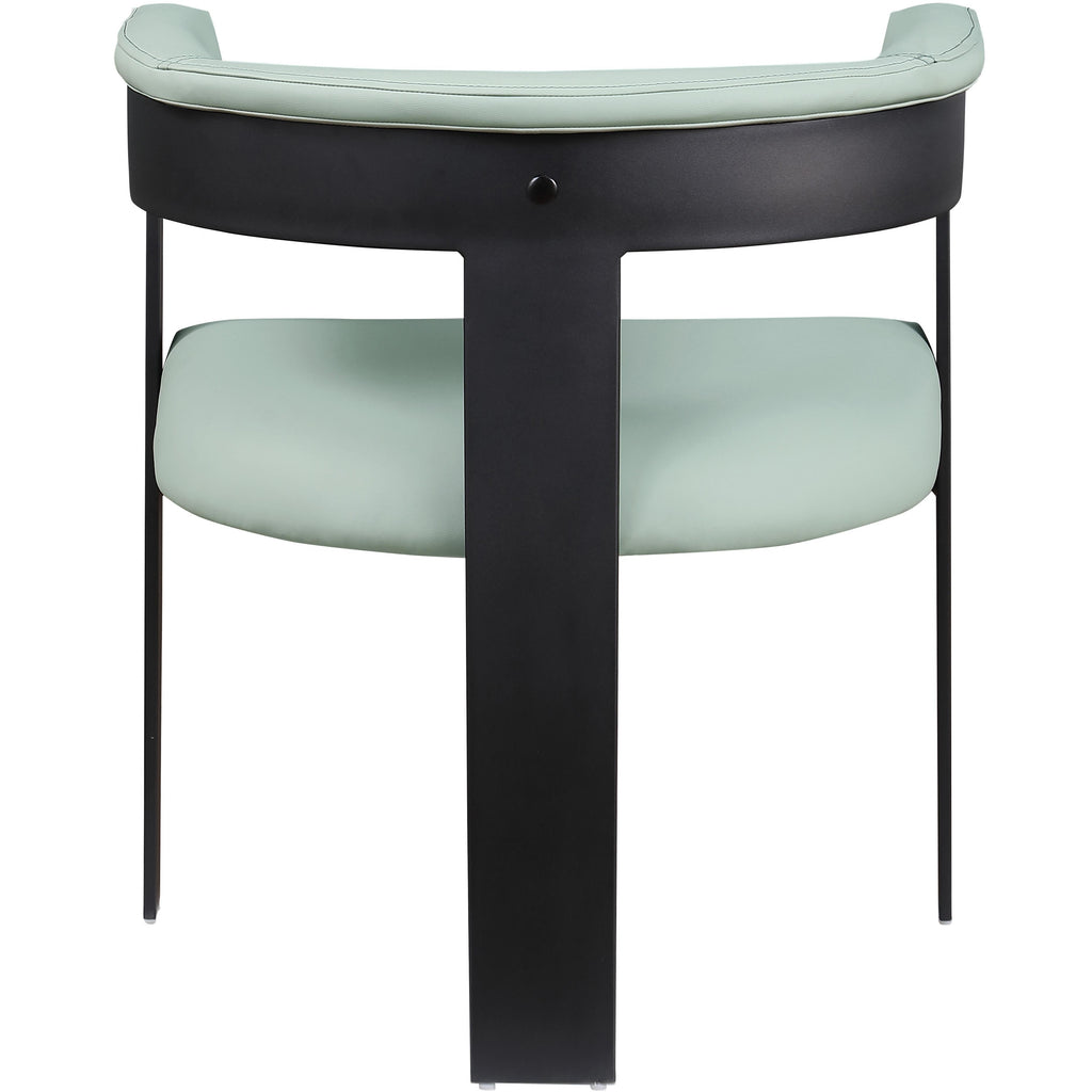 Rehab your dining area with these mint green Romeo vegan leather dining chairs, sold as a set of two. These chairs offer both style and comfort, with soft mint green vegan leather seats and backs providing a sleek and inviting look that meshes well with an array of dining tables. The matte black metal frame ensures durability and modern aesthetic appeal, while the chairs' curved backs deliver lumbar support for a relaxed dining experience.