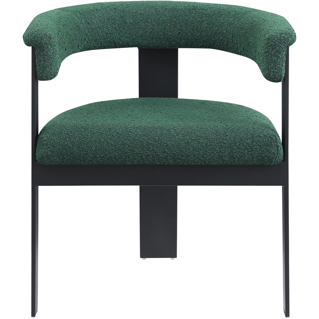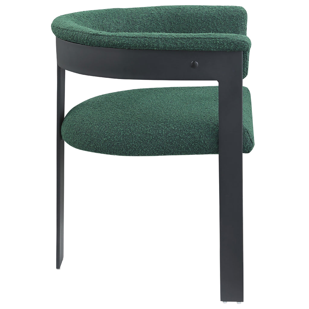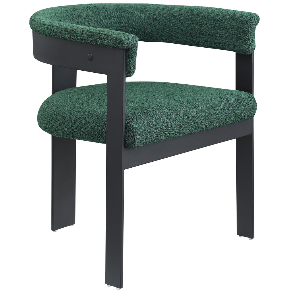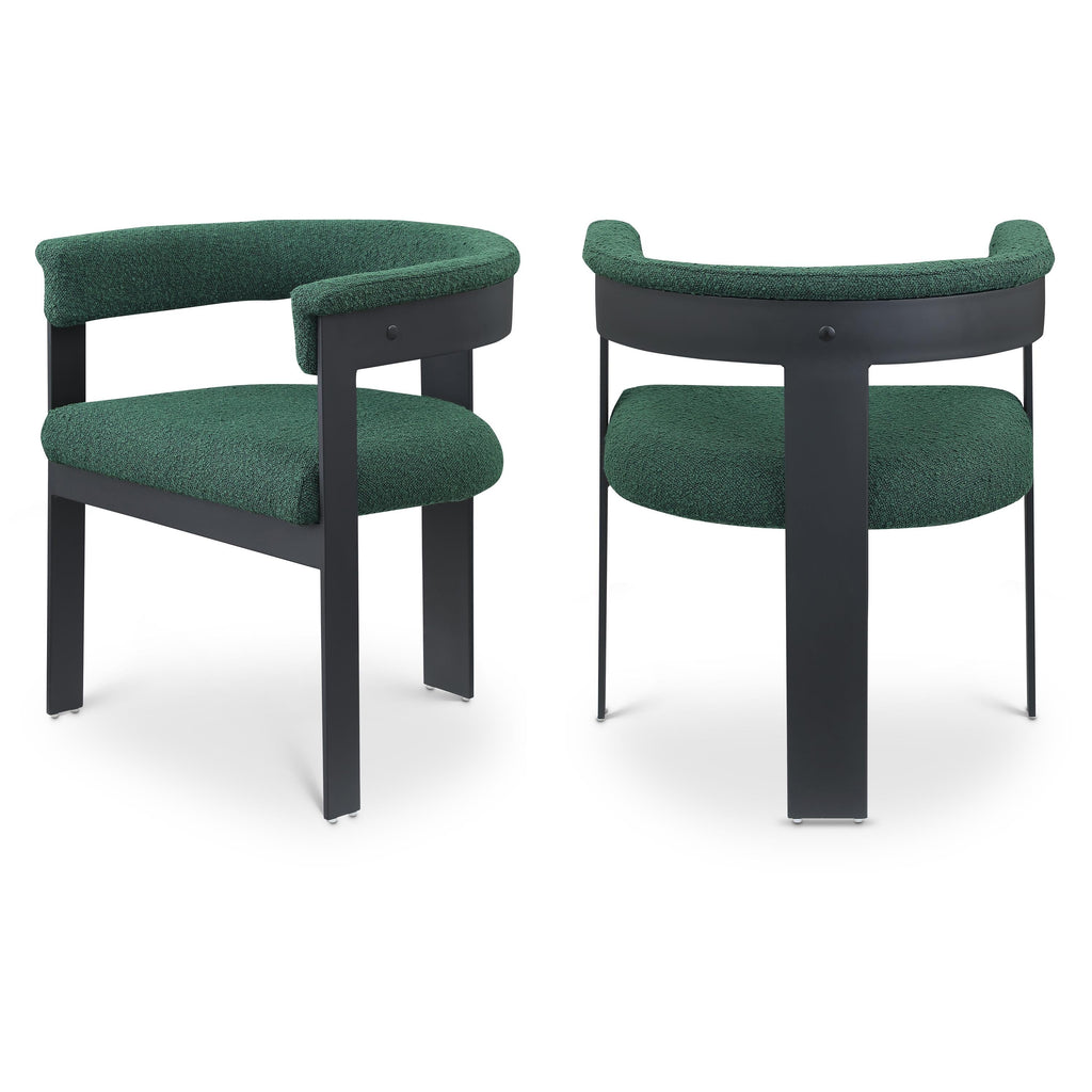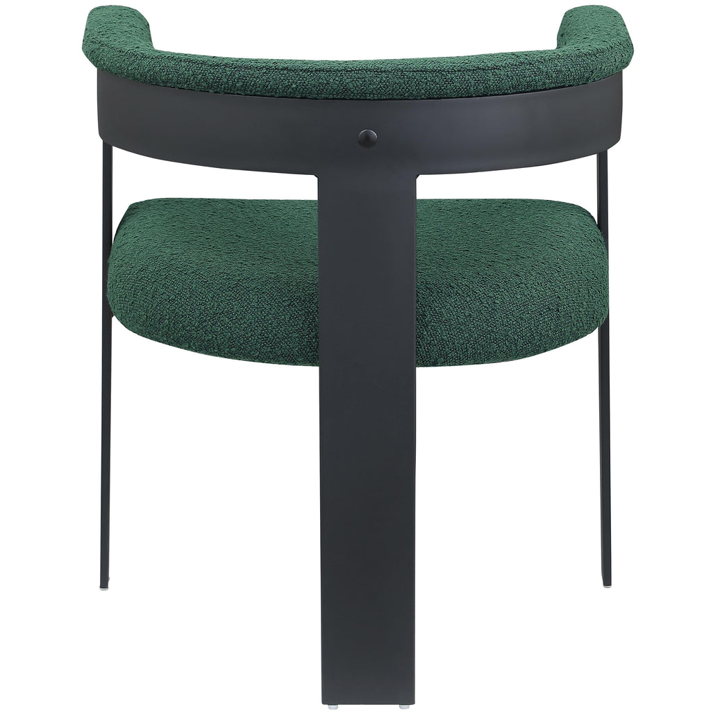 Rehab your dining area with these green Romeo boucle dining chairs, sold as a set of two. These chairs offer both style and comfort, with soft green boucle seats and backs providing a sleek and inviting look that meshes well with an array of dining tables. The matte black metal frame ensures durability and modern aesthetic appeal, while the chairs' curved backs deliver lumbar support for a relaxed dining experience.