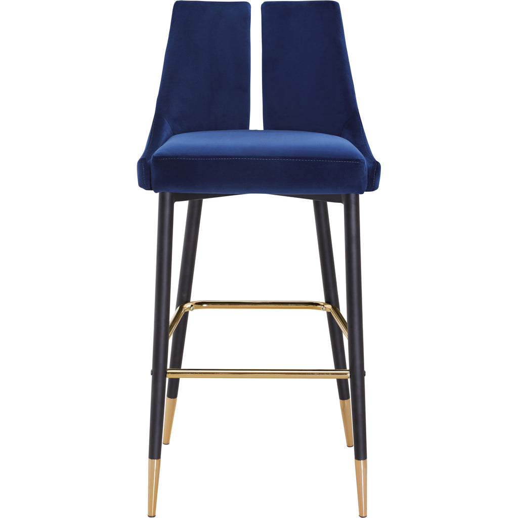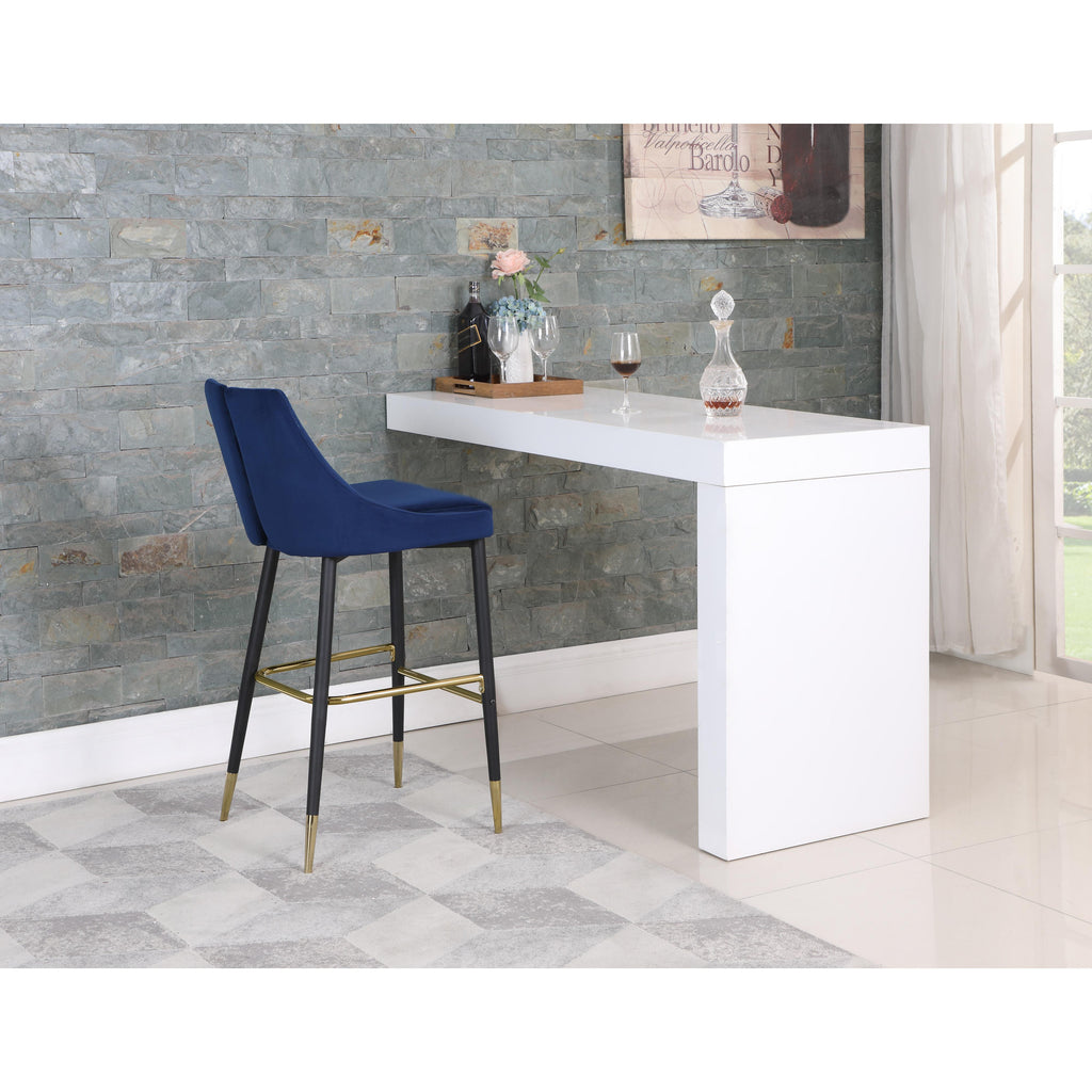 Define your home bar or kitchen counter in style with this Sleek Bar Stool from Meridian Furniture. It features a bar height design for easy integration with your existing setup, and it's upholstered in soft navy velvet material for a luxe look. The contemporary design makes this stool well at home in modern spaces, and the matte black metal legs with gold tips add to its modish appearance in your room.