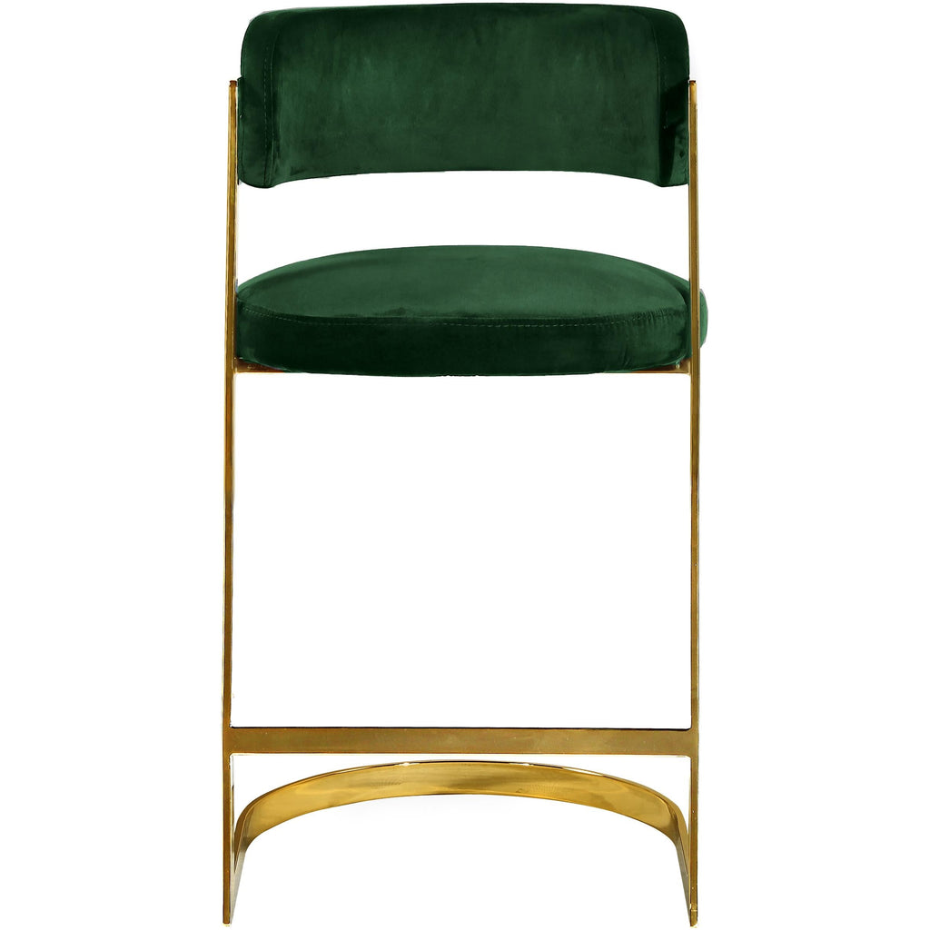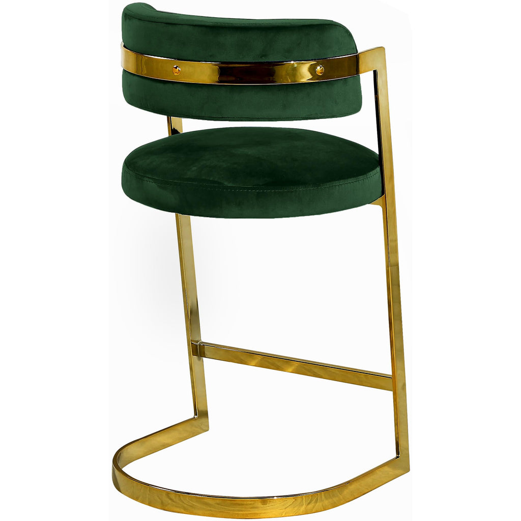 Create an elegant look in your kitchen and beyond with our Stephanie Velvet Counter Stool. A metal base finished in gold gives it a glamorous contemporary look. The high quality velvet upholstery is soft and luxuriously plush, with a padded seat and back cushion.
