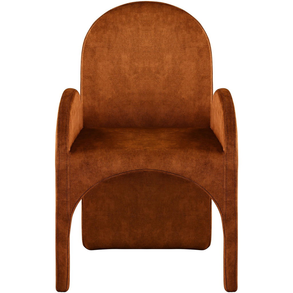 Turn your dining room into a regal haven with this Summer cognac velvet dining arm chair. Featuring a luxurious cognac velvet upholstery, this fully upholstered armchair offers comfort and support while you enjoy your meals. Its steel frame ensures durability, so you can enjoy the chair for years to come. Its arched, contemporary design is both unique and fashionable, providing your dinner guests with a conversation piece as well as a comfortable place to sit.