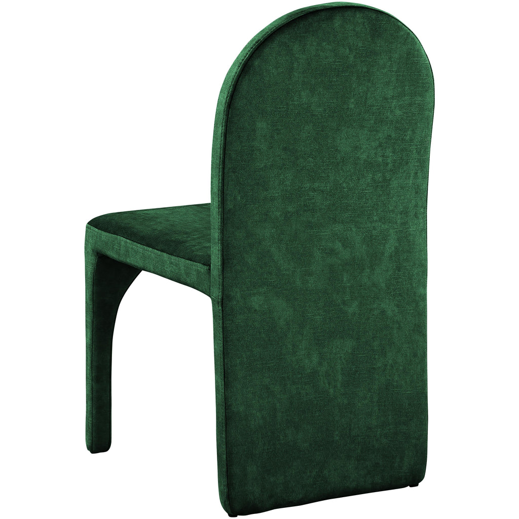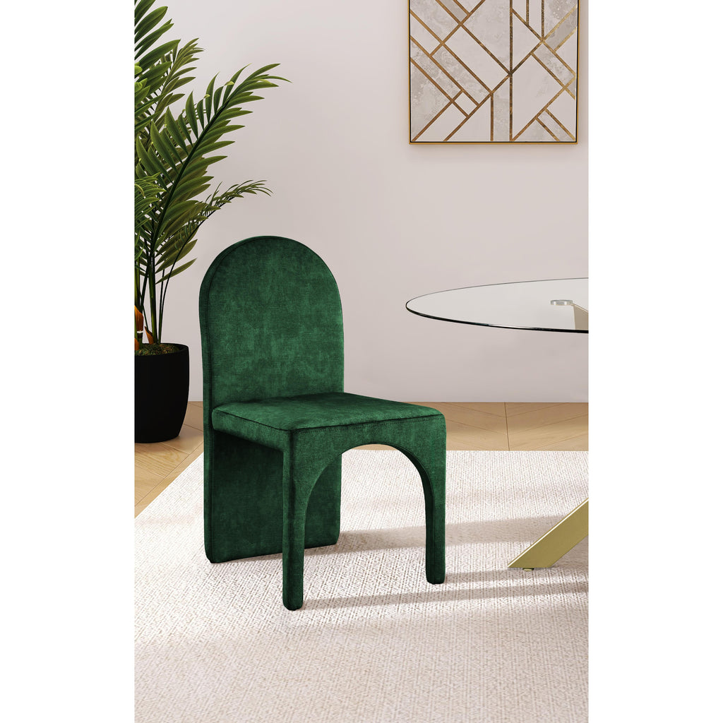 Turn your dining room into a regal haven with this Summer green velvet dining side chair. Featuring a luxurious green velvet upholstery, this fully upholstered side chair offers comfort and support while you enjoy your meals. Its steel frame ensures durability, so you can enjoy the chair for years to come. Its arched, contemporary design is both unique and fashionable, providing your dinner guests with a conversation piece as well as a comfortable place to sit.