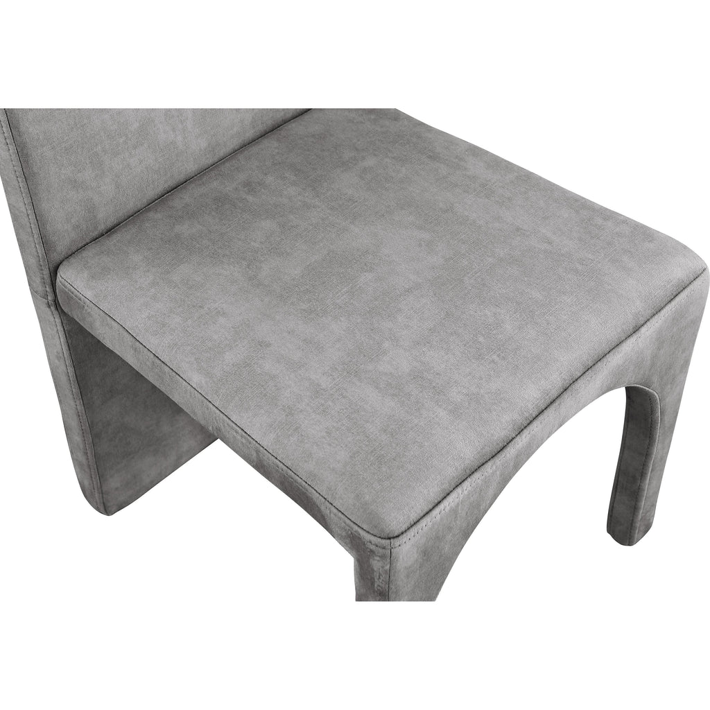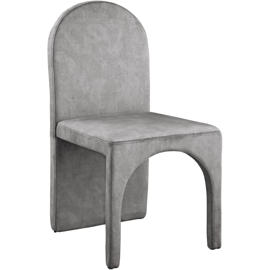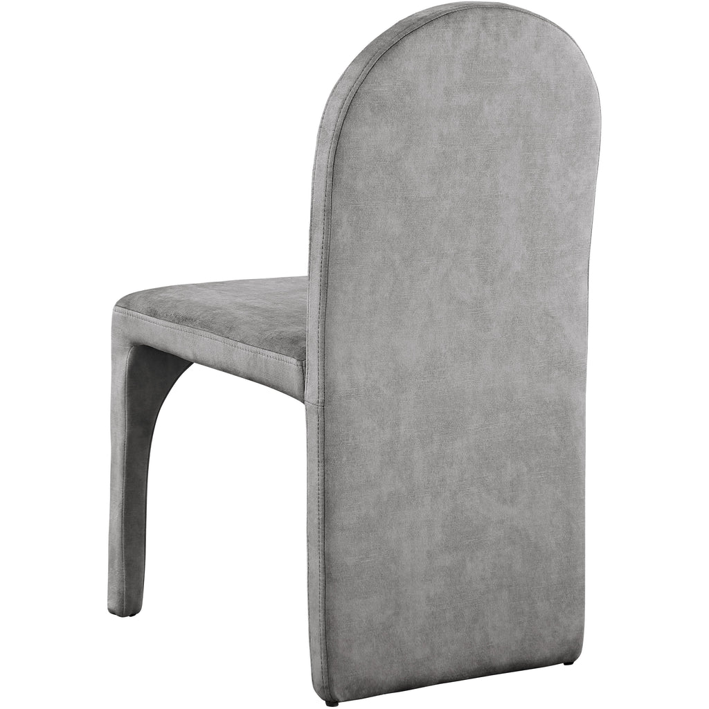 Turn your dining room into a regal haven with this Summer grey velvet dining side chair. Featuring a luxurious grey velvet upholstery, this fully upholstered side chair offers comfort and support while you enjoy your meals. Its steel frame ensures durability, so you can enjoy the chair for years to come. Its arched, contemporary design is both unique and fashionable, providing your dinner guests with a conversation piece as well as a comfortable place to sit.
