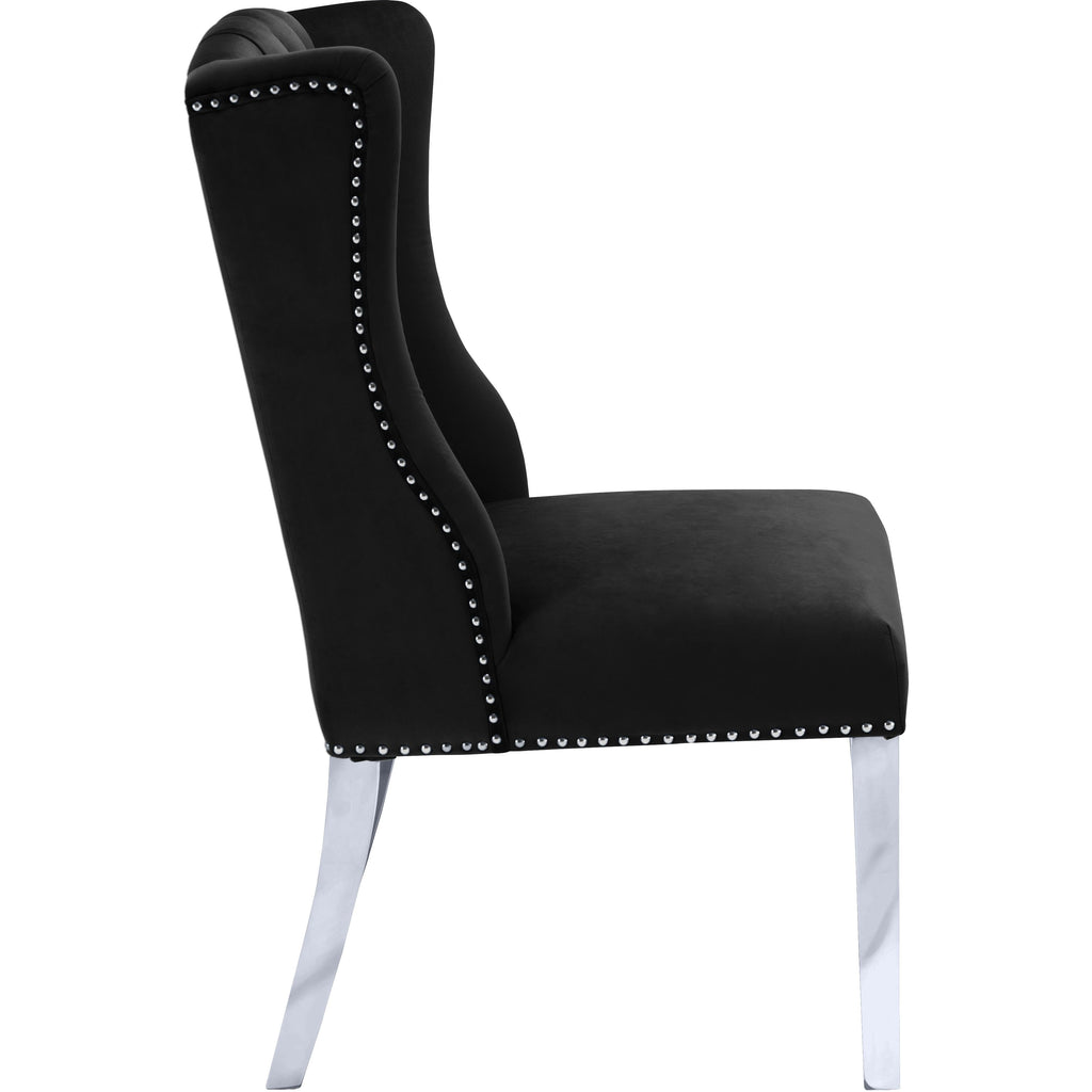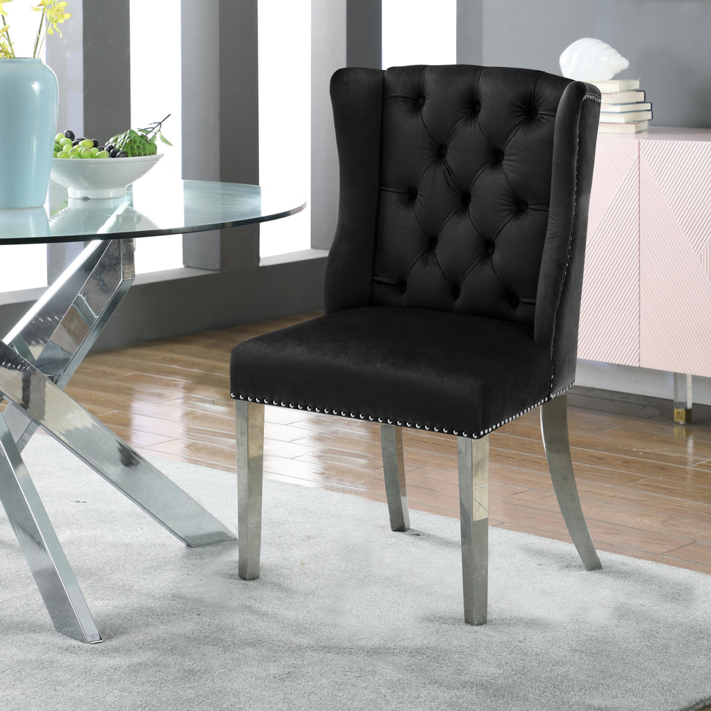 Keep a dinner guest feeling like an MVP in this Suri velvet dining chair. This chair features soft black velvet upholstery that's svelte to the touch and sleek against the skin. Deep button tufting on the back adds an air of elegance and affluence to the look of this chair, while a chrome knocker accent on the back, chrome nailheads, and chrome stainless steel legs gives it a definitive modern, contemporary flair.