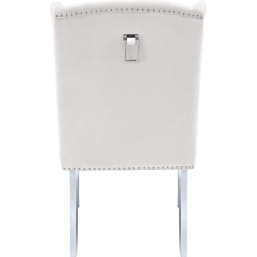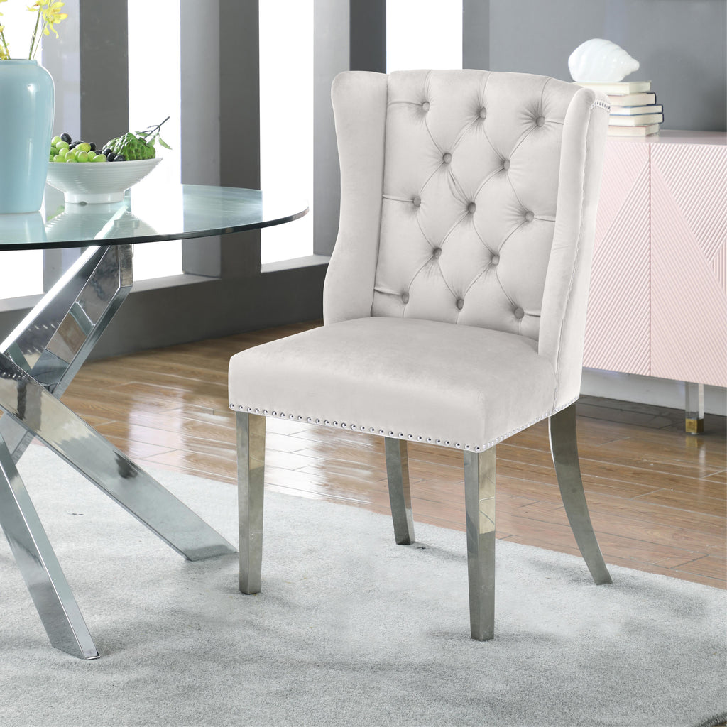 Keep a dinner guest feeling like an MVP in this Suri velvet dining chair. This chair features soft cream velvet upholstery that's svelte to the touch and sleek against the skin. Deep button tufting on the back adds an air of elegance and affluence to the look of this chair, while a chrome knocker accent on the back, chrome nailheads, and chrome stainless steel legs gives it a definitive modern, contemporary flair.