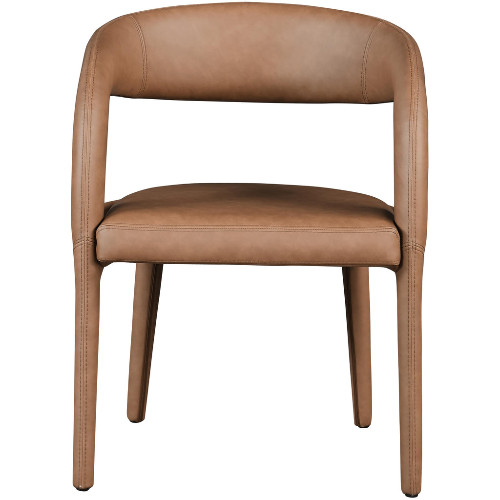 Modernize your home with this Sylvester brown vegan leather dining chair. Featuring soft and durable brown vegan leather upholstery, this chair offers you a comfortable and long-lasting place to sit while you dine. It's fully upholstered, giving it a solid look that is ideal for any contemporary home. Its rounded back provides upper back support, while its semi-open design makes a fashionable decorative statement that is sure to catch the eyes of anyone who joins you for dinner.